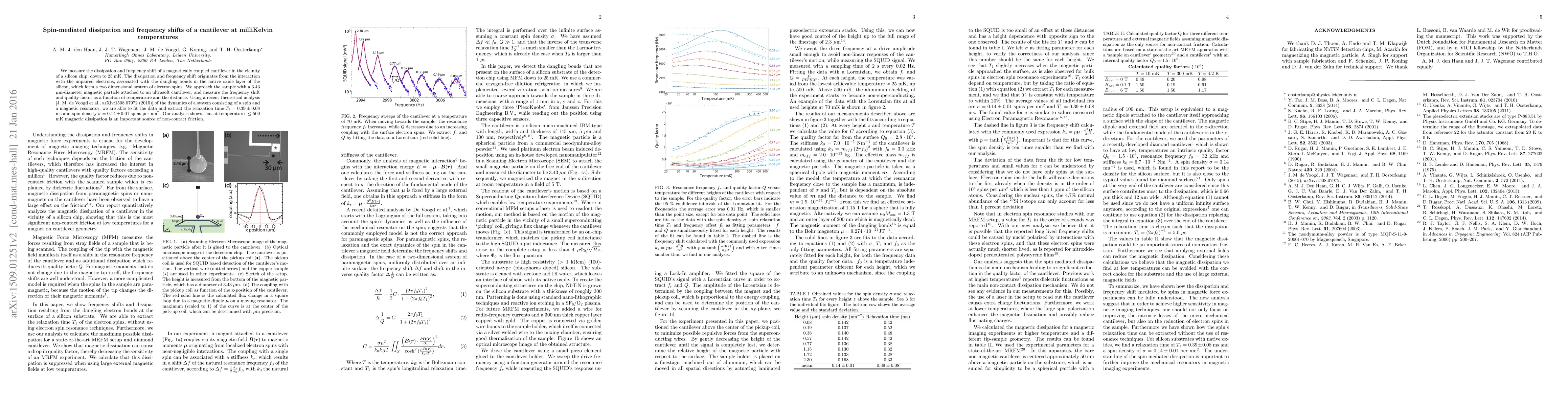 We measure the dissipation and frequency shift of a magnetically coupled cantilever in the vicinity of a silicon chip, down to $25$ mK. The dissipation and frequency shift originates from the interaction with the unpaired electrons, associated with the dangling bonds in the native oxide layer of the silicon, which form a two dimensional system of electron spins. We approach the sample with a $3.43$ $\mu$m-diameter magnetic particle attached to an ultrasoft cantilever, and measure the frequency shift and quality factor as a function of temperature and the distance. Using a recent theoretical analysis [J. M. de Voogd et al., arXiv:1508.07972 (2015)] of the dynamics of a system consisting of a spin and a magnetic resonator, we are able to fit the data and extract the relaxation time $T_1=0.39\pm0.08$ ms and spin density $\sigma=0.14\pm0.01$ spins per nm$^2$. Our analysis shows that at temperatures $\leq500$ mK magnetic dissipation is an important source of non-contact friction.