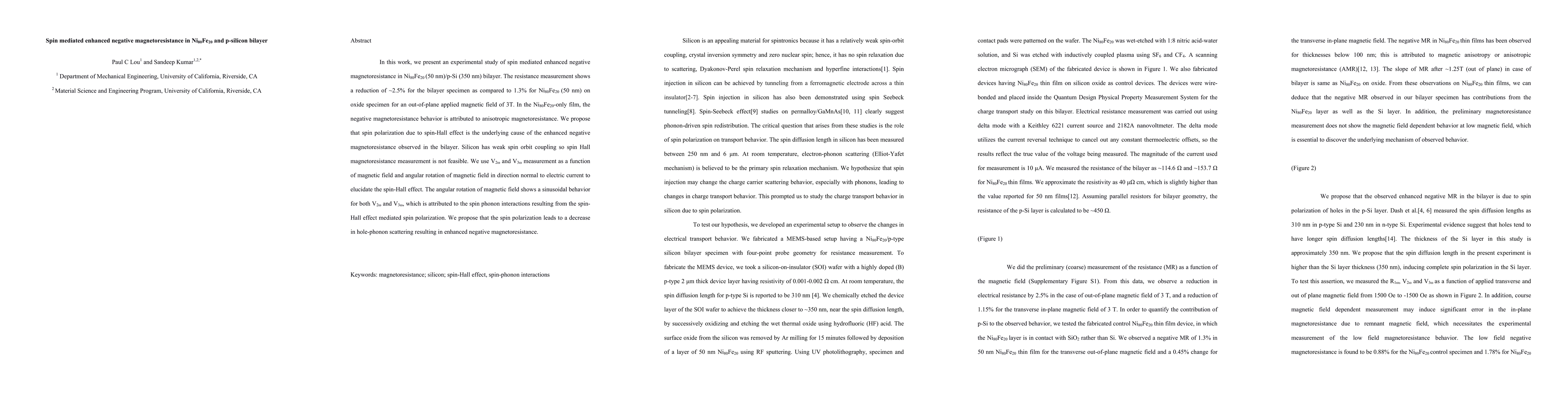 In this work, we present an experimental study of spin mediated enhanced negative magnetoresistance in Ni80Fe20 (50 nm)/p-Si (350 nm) bilayer. The resistance measurement shows a reduction of ~2.5% for the bilayer specimen as compared to 1.3% for Ni80Fe20 (50 nm) on oxide specimen for an out-of-plane applied magnetic field of 3T. In the Ni80Fe20-only film, the negative magnetoresistance behavior is attributed to anisotropic magnetoresistance. We propose that spin polarization due to spin-Hall effect is the underlying cause of the enhanced negative magnetoresistance observed in the bilayer. Silicon has weak spin orbit coupling so spin Hall magnetoresistance measurement is not feasible. We use V2{\omega} and V3{\omega} measurement as a function of magnetic field and angular rotation of magnetic field in direction normal to electric current to elucidate the spin-Hall effect. The angular rotation of magnetic field shows a sinusoidal behavior for both V2{\omega} and V3{\omega}, which is attributed to the spin phonon interactions resulting from the spin-Hall effect mediated spin polarization. We propose that the spin polarization leads to a decrease in hole-phonon scattering resulting in enhanced negative magnetoresistance.
