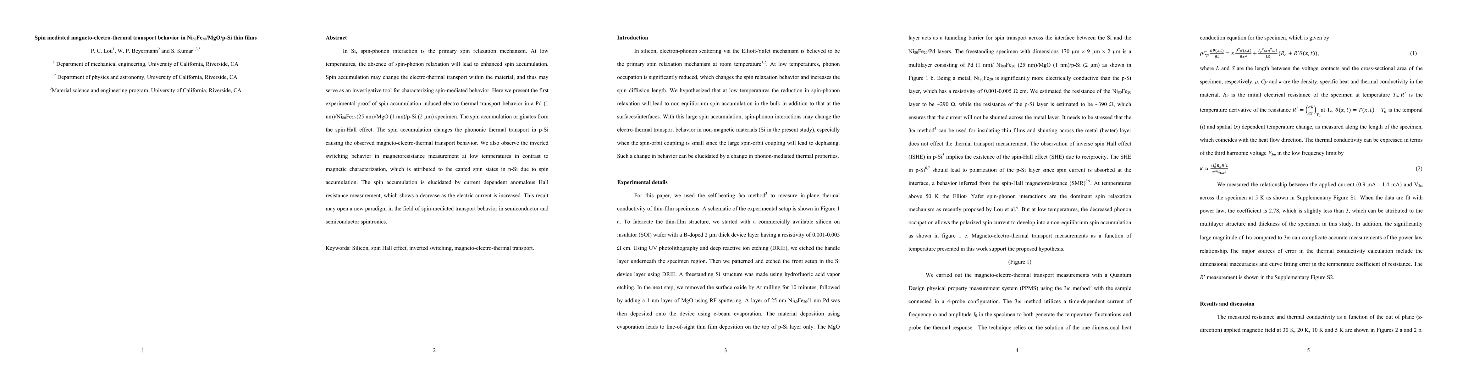 This paper demonstrates the first experimental evidence of spin accumulation-induced electro-thermal transport in Ni80Fe20/MgO/p-Si thin films, revealing magneto-electro-thermal behavior due to the spin-Hall effect. The study also highlights an inverted switching behavior in magnetoresistance linked to canted spin states in p-Si.
