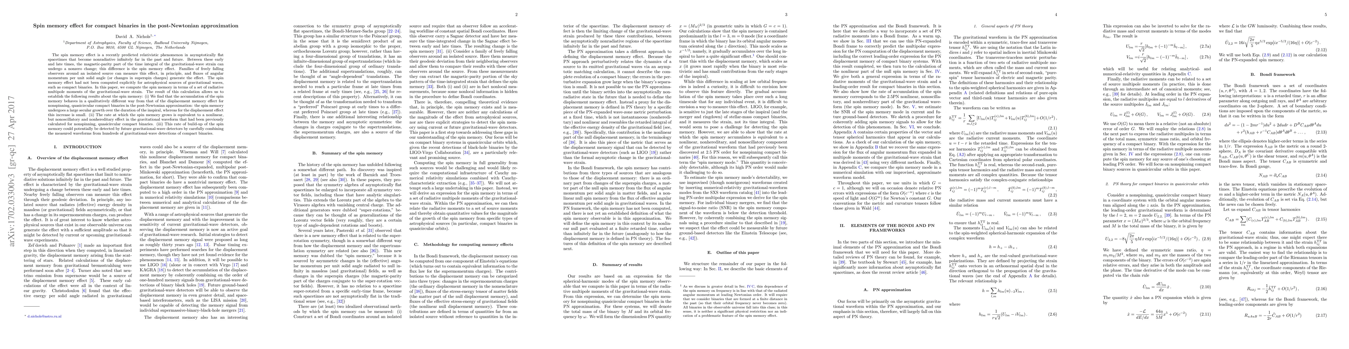 The spin memory effect is a recently predicted relativistic phenomenon in asymptotically flat spacetimes that become nonradiative infinitely far in the past and future. Between these early and late times, the magnetic-parity part of the time integral of the gravitational-wave strain can undergo a nonzero change; this difference is the spin memory effect. Families of freely falling observers around an isolated source can measure this effect, in principle, and fluxes of angular momentum per unit solid angle (or changes in superspin charges) generate the effect. The spin memory effect had not been computed explicitly for astrophysical sources of gravitational waves, such as compact binaries. In this paper, we compute the spin memory in terms of a set of radiative multipole moments of the gravitational-wave strain. The result of this calculation allows us to establish the following results about the spin memory: (i) We find that the accumulation of the spin memory behaves in a qualitatively different way from that of the displacement memory effect for nonspinning, quasicircular compact binaries in the post-Newtonian approximation: the spin memory undergoes a large secular growth over the duration of the inspiral, whereas for the displacement effect this increase is small. (ii) The rate at which the spin memory grows is equivalent to a nonlinear, but nonoscillatory and nonhereditary effect in the gravitational waveform that had been previously calculated for nonspinning, quasicircular compact binaries. (iii) This rate of build-up of the spin memory could potentially be detected by future gravitational-wave detectors by carefully combining the measured waveforms from hundreds of gravitational-wave detections of compact binaries.