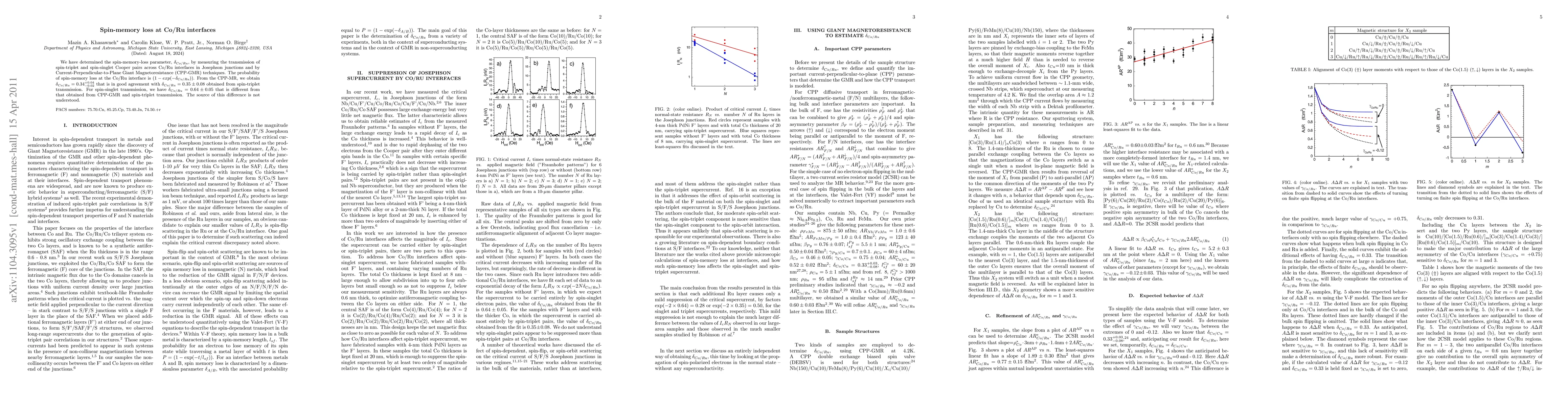 We have determined the spin-memory-loss parameter, $\delta_{Co/Ru}$, by measuring the transmission of spin-triplet and spin-singlet Cooper pairs across Co/Ru interfaces in Josephson junctions and by Current-Perpendicular-to-Plane Giant Magnetoresistance (CPP-GMR) techniques. The probability of spin-memory loss at the Co/Ru interface is $(1-exp(-\delta_{Co/Ru}))$. From the CPP-MR, we obtain $\delta_{Co/Ru} = 0.34^{+0.04}_{-0.02}$ that is in good agreement with $\delta_{Co/Ru} = 0.35 \pm 0.08$ obtained from spin-triplet transmission. For spin-singlet transmission, we have $\delta_{Co/Ru} = 0.64 \pm 0.05$ that is different from that obtained from CPP-GMR and spin-triplet transmission. The source of this difference is not understood.