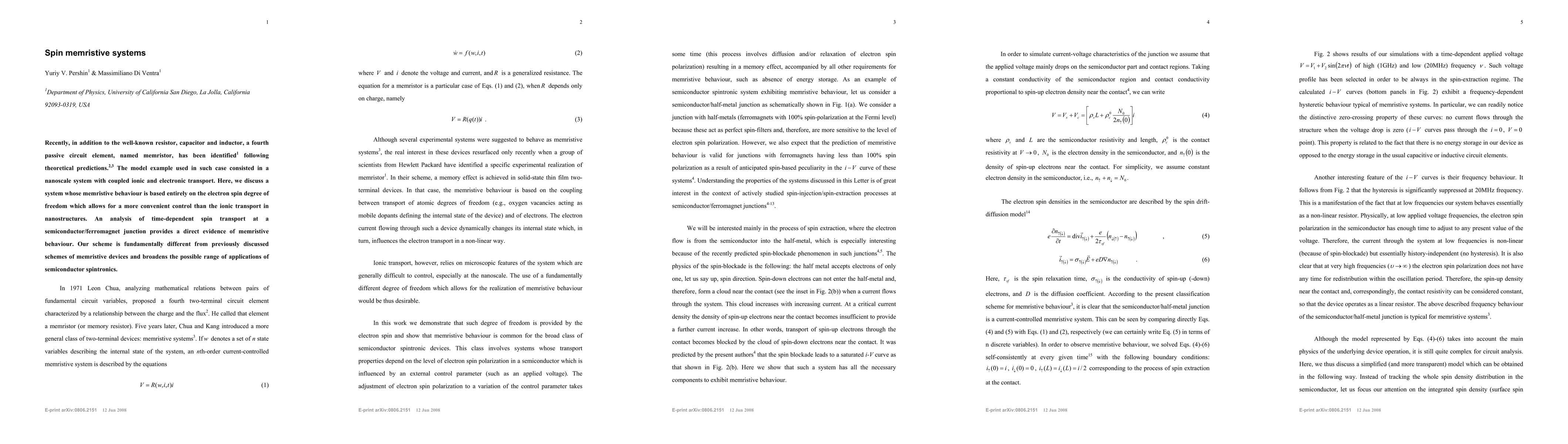 This paper introduces a novel spin memristive system based on electron spin transport in semiconductor/ferromagnet junctions, offering a more controllable alternative to ionic-based memristors and expanding the applications of semiconductor spintronics. The study provides direct evidence of memristive behavior through time-dependent spin transport analysis.
