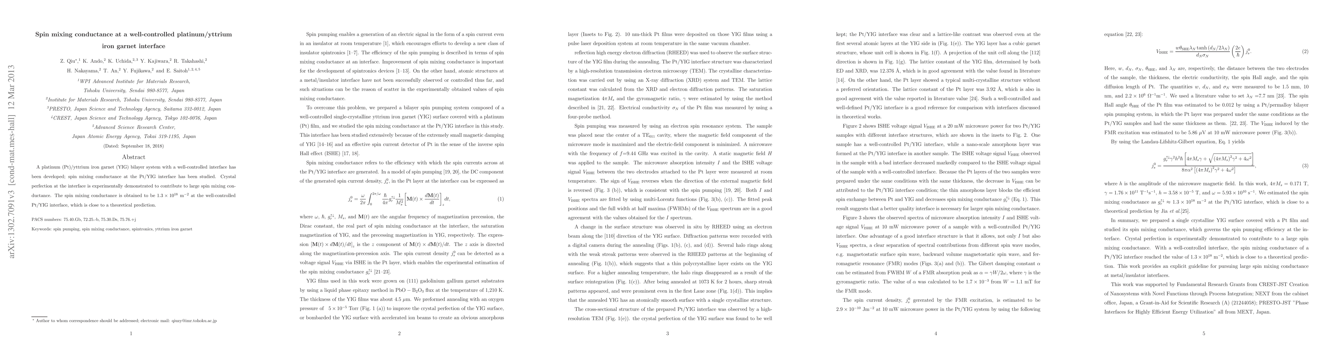 A platinum (Pt)/yttrium iron garnet (YIG) bilayer system with a well-controlled interface has been developed; spin mixing conductance at the Pt/YIG interface has been studied. Crystal perfection at the interface is experimentally demonstrated to contribute to large spin mixing conductance. The spin mixing conductance is obtained to be $1.3\times10^{18} \rm{m^{-2}}$ at the well-controlled Pt/YIG interface, which is close to a theoretical prediction.