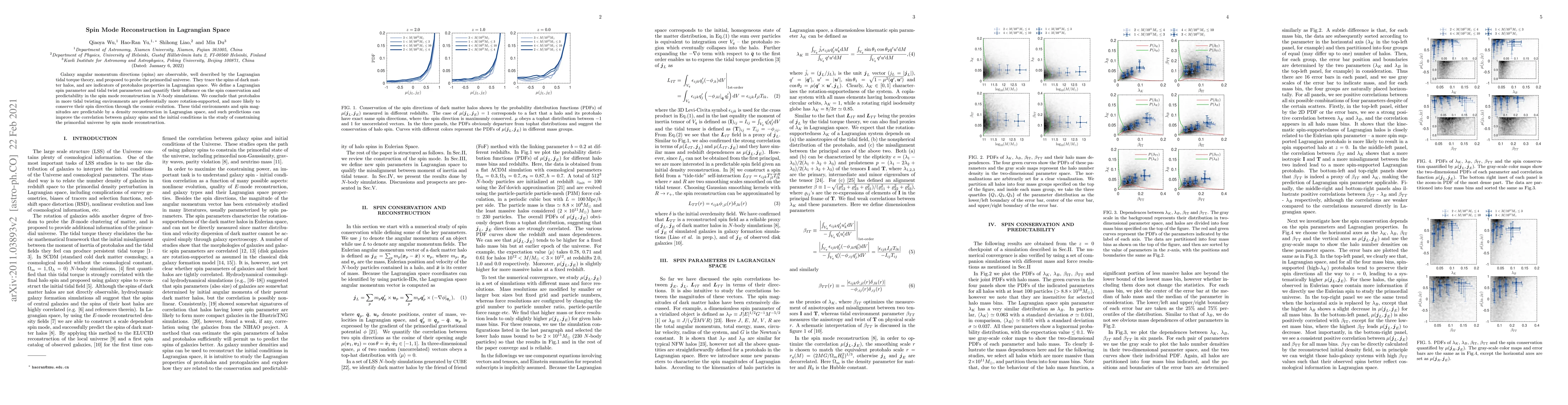 This paper explores how galaxy spins, traced back to dark matter halos, can reveal primordial universe properties through Lagrangian tidal torque theory. It finds that protohalos in high tidal twisting environments tend to conserve their spin direction and are more rotation-supported, with these characteristics predictable via density reconstruction in Lagrangian space.