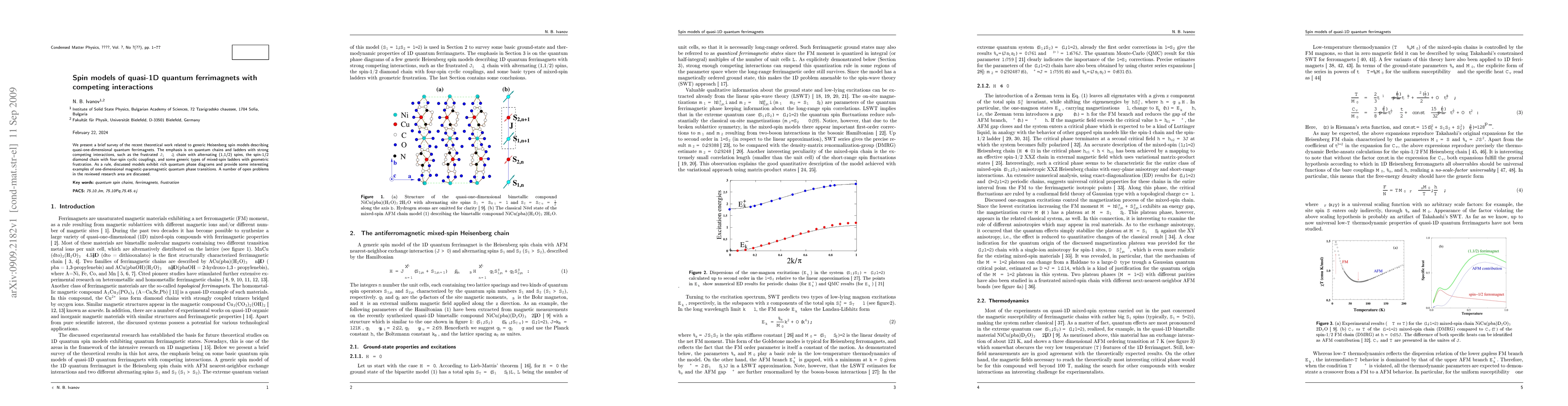 This paper surveys recent theoretical studies on quasi-1D quantum ferrimagnets, focusing on spin models like the $J_1-J_2$ chain and spin-1/2 diamond chain with complex interactions, highlighting their rich quantum phase diagrams and one-dimensional magnetic-paramagnetic transitions, while also noting remaining open questions.
