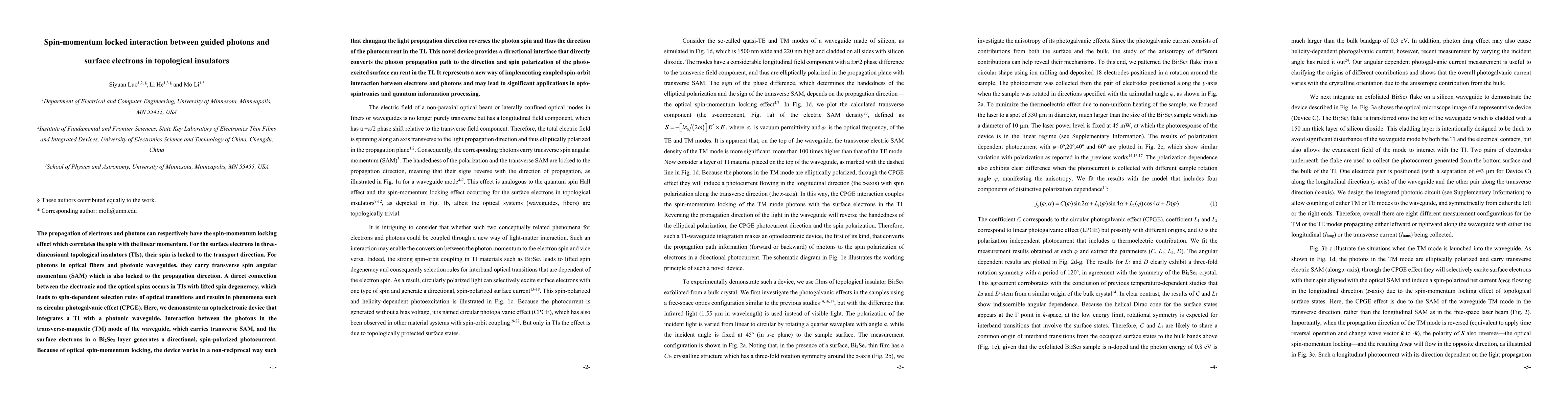 This paper demonstrates a novel optoelectronic device that integrates a topological insulator (TI) with a photonic waveguide, showing a spin-momentum locked interaction between guided photons and surface electrons. The device converts photon propagation direction into the direction and spin polarization of the photo-excited surface current, enabling non-reciprocal operation and potential applications in opto-spintronics and quantum information processing.