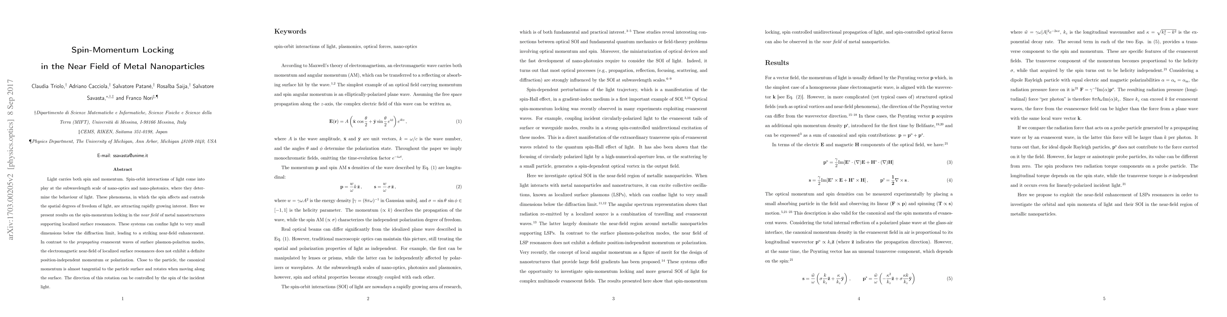Light carries both spin and momentum. Spin-orbit interactions of light come into play at the subwavelength scale of nano-optics and nano-photonics, where they determine the behaviour of light. These phenomena, in which the spin affects and controls the spatial degrees of freedom of light, are attracting rapidly growing interest. Here we present results on the spin-momentum locking in the near field of metal nanostructures supporting localized surface resonances. These systems can confine light to very small dimensions below the diffraction limit, leading to a striking near-field enhancement. In contrast to the propagating evanescent waves of surface plasmon-polariton modes, the electromagnetic near-field of localized surface resonances does not exhibit a definite position-independent momentum or polarization. Our results can be useful to investigate the spin-orbit interactions of light for complex evanescent fields. Note that the spin of the incident light can control the rotation direction of the canonical momentum.