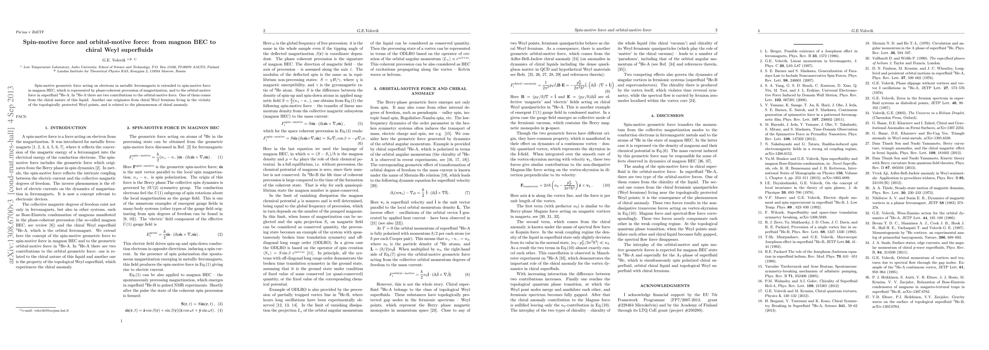Spin-motive geometric force acting on electrons in metallic ferromagnets is extended to spin-motive force in magnon BEC, which is represented by phase-coherent precession of magnetization, and to the orbital-motive force in superfluid 3He-A. In 3He-A there are two contributions to the orbital-motive force. One of them comes from the chiral nature of this liquid. Another one originates from chiral Weyl fermions living in the vicinity of the topologically protected Weyl points, and is related to the phenomenon of chiral anomaly.