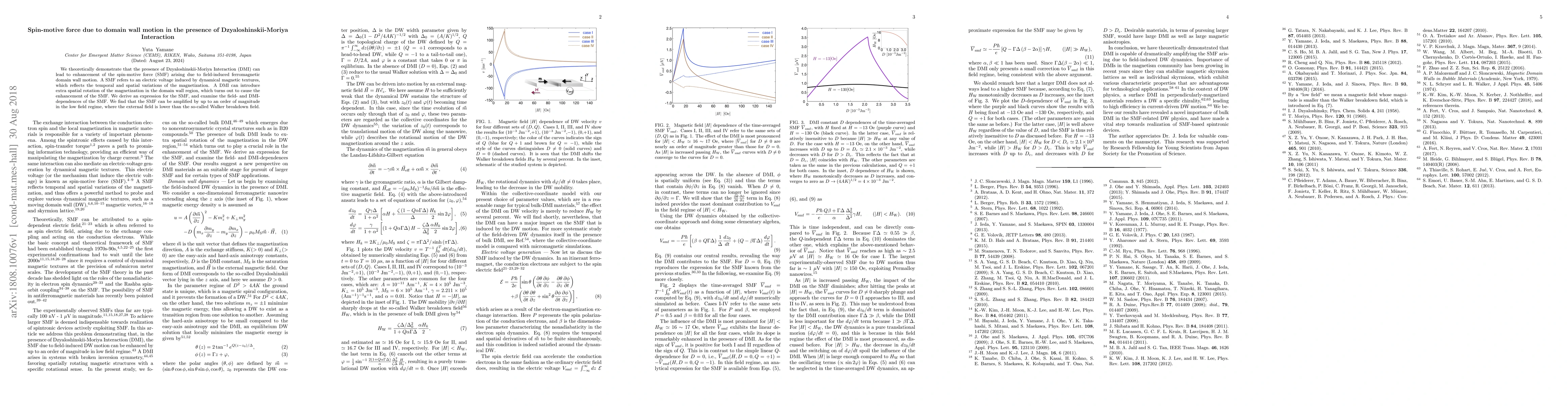 This paper theoretically demonstrates that Dzyaloshinskii-Moriya Interaction (DMI) enhances the spin-motive force (SMF) from domain wall motion, with the SMF amplified up to an order of magnitude in low field conditions. The study derives an expression for SMF and analyzes its dependence on both field strength and DMI.