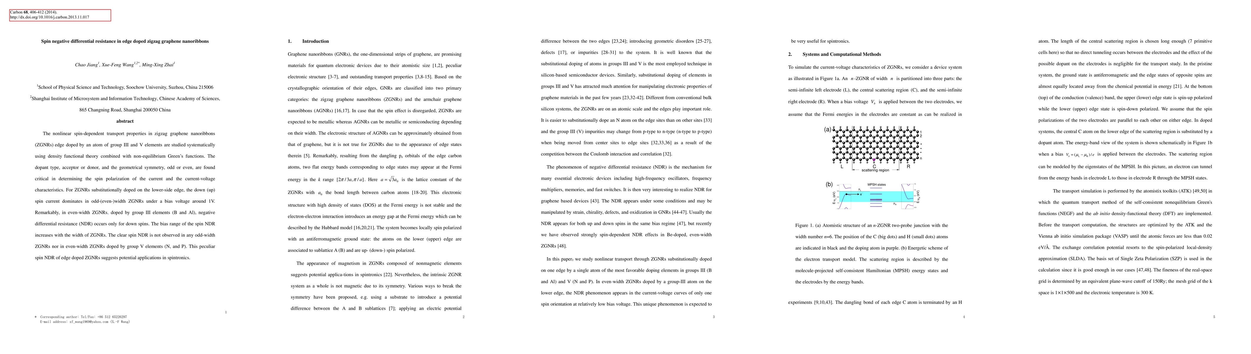 This paper investigates the spin-dependent transport properties in zigzag graphene nanoribbons (ZGNRs) edge doped with group III or V elements, revealing that dopant type and ribbon width significantly influence spin polarization and current-voltage characteristics. Notably, even-width ZGNRs doped with group III elements exhibit negative differential resistance (NDR) exclusively for down spins, suggesting potential spintronic applications.
