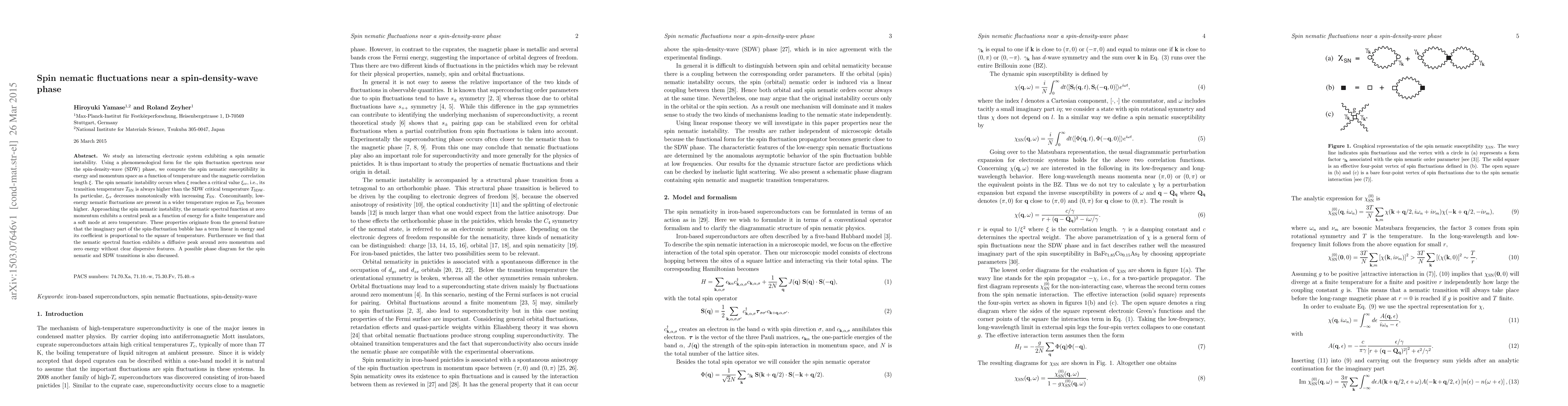 Researchers study a spin nematic instability in an electronic system near a spin-density-wave phase, finding that it occurs at a critical magnetic correlation length, leading to higher transition temperatures.