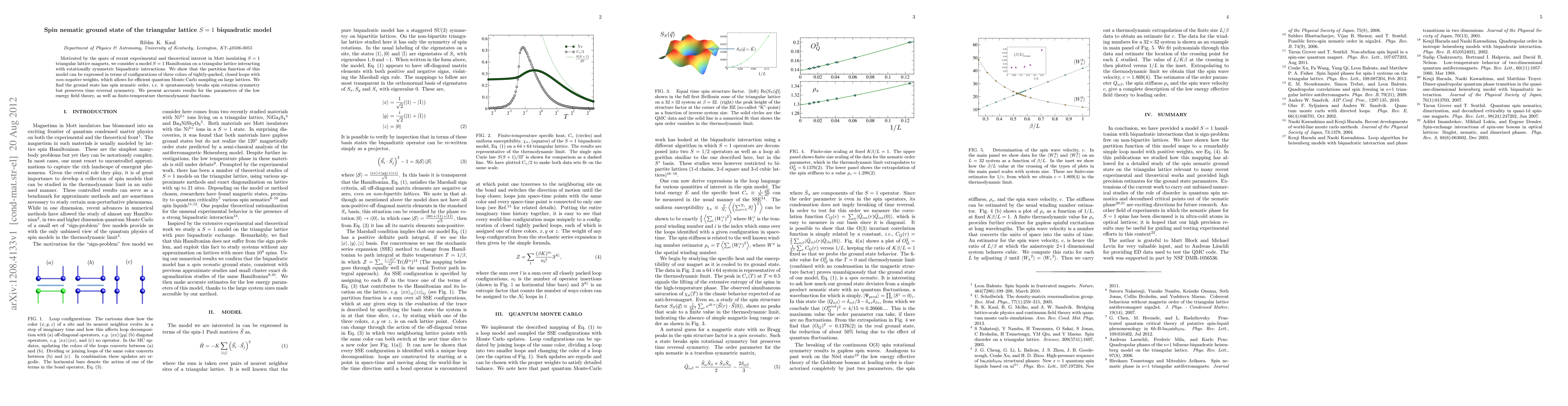 This paper investigates the S=1 biquadratic model on a triangular lattice, demonstrating that its ground state exhibits spin nematic order. The authors utilize efficient quantum Monte Carlo sampling to reveal the spontaneous breaking of spin rotation symmetry while preserving time reversal symmetry.