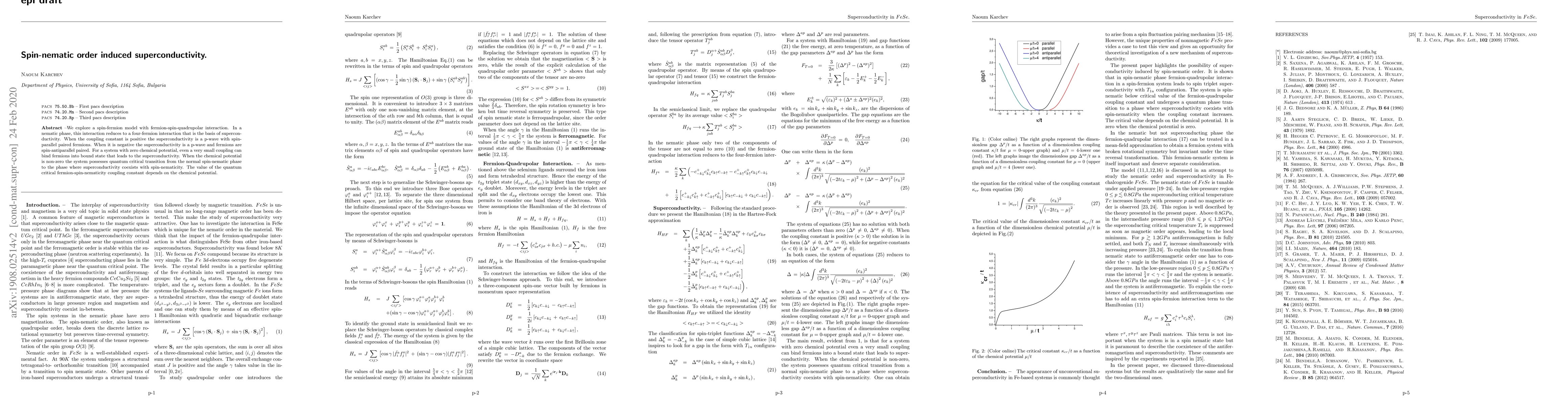We explore a spin-fermion model with fermion-spin-quadrupolar interaction. In a nematic phase, this interaction reduces to a four-fermion interaction that is a basis of superconductivity. When the coupling constant is positive the superconductivity is p-wave with spin-parallel paired fermions. When it is negative the superconductivity is p-wave and fermions are spin-antiparallel paired. For a system with zero chemical potential, even a very small coupling can bind fermions into bound state that leads to the superconductivity. When the chemical potential is non-zero the system possesses quantum critical transition from normal spin-nematic phase to phase where superconductivity coexists with spin-nematicity. The value of the quantum critical fermion-spin-nematicity coupling constant depends on the chemical potential.