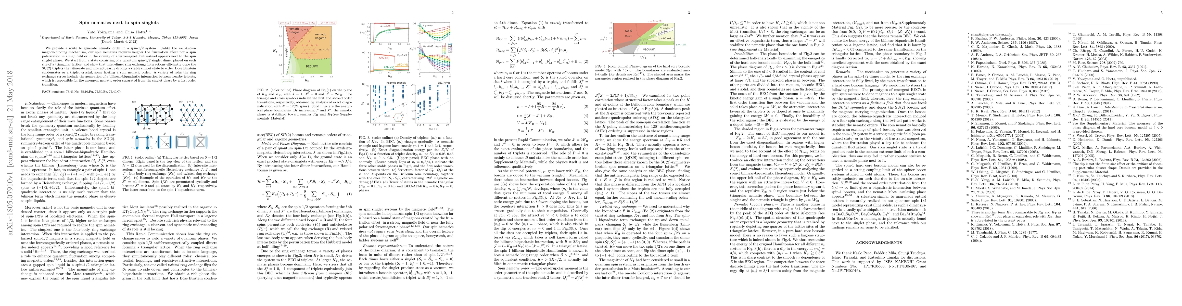 We provide a route to generate nematic order in a spin-1/2 system. Unlike the well-known magnon-binding mechanism, our spin nematics requires neigher the frustration effect nor a spin polarization in a high field or in the vicinity of a ferromagnet, but instead appears next to the spin singlet phase. We start from a state consisting of a quantum spin-1/2 singlet dimer placed on each site of a triangular lattice, and show that inter-dimer ring exchange interactions efficiently dope the SU(2) triplets that itinerate and interact, easily driving a stable singlet state to either Bose Einstein condensates or a triplet crystal, some hosting a spin nematic order. A variety of roles the ring exchange serves include the generation of a bilinear-biquadratic interaction between nearby triplets, which is responsible for the emergent nematic order separated from the singlet phase by a first order transition.