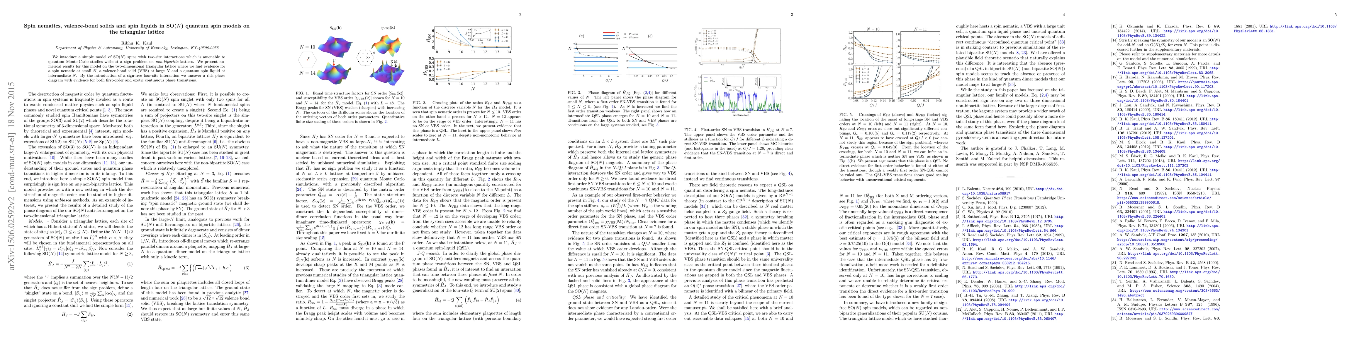We introduce a simple model of SO($N$) spins with two-site interactions which is amenable to quantum Monte-Carlo studies without a sign problem on non-bipartite lattices. We present numerical results for this model on the two-dimensional triangular lattice where we find evidence for a spin nematic at small $N$, a valence-bond solid (VBS) at large $N$ and a quantum spin liquid at intermediate $N$. By the introduction of a sign-free four-site interaction we uncover a rich phase diagram with evidence for both first-order and exotic continuous phase transitions.