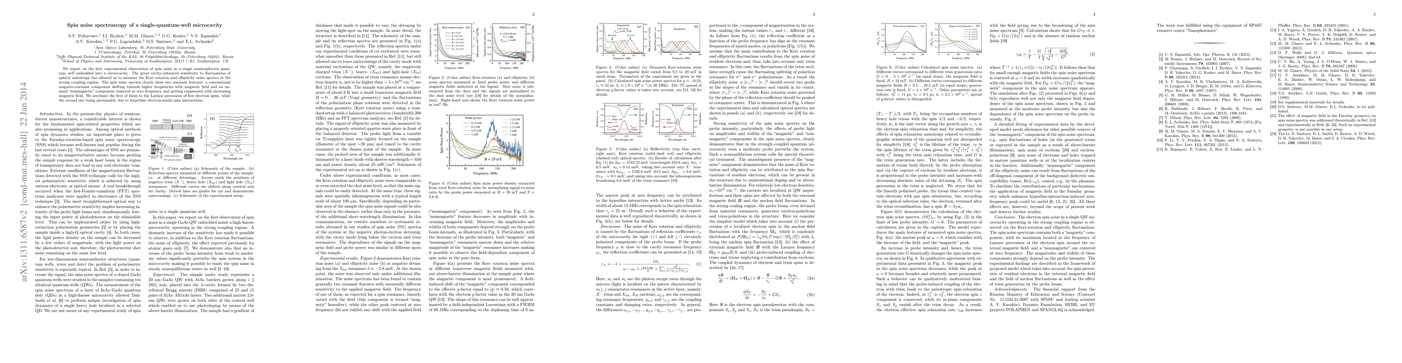 This study reports the first observation of spin noise in a single quantum well within a microcavity, revealing two resonant features: a magneto-resonant component linked to Larmor precession of free electron spins and a nonmagnetic component likely due to hyperfine electron-nuclei interactions.