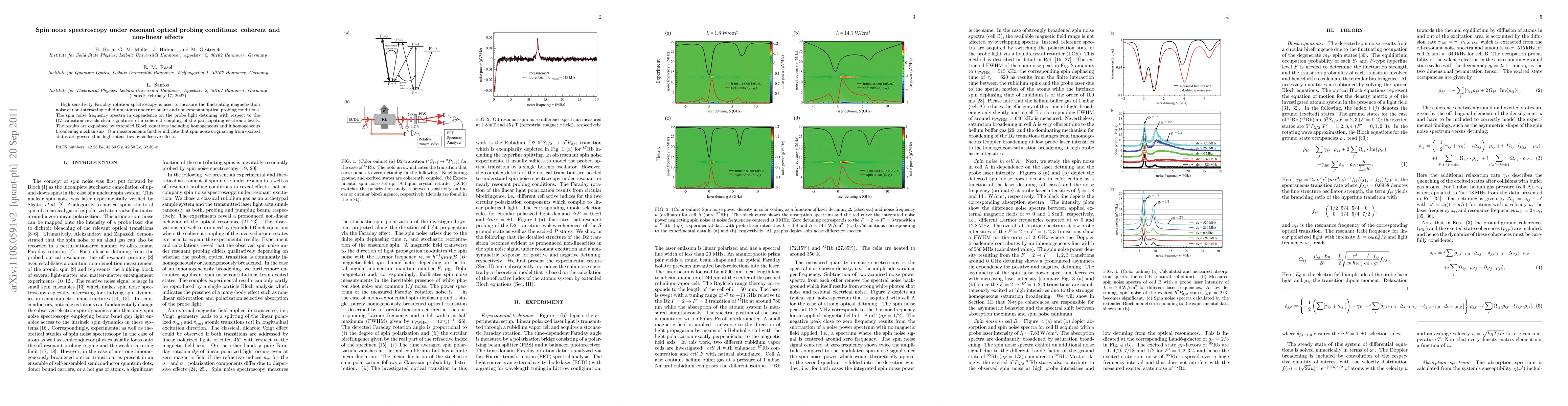This study employs high sensitivity Faraday rotation spectroscopy to measure spin noise in rubidium atoms under resonant optical probing, revealing coherent coupling effects in the electronic levels. The findings suggest that collective effects dominate spin noise from excited states at high probe intensities, explained by extended Bloch equations accounting for broadening mechanisms.