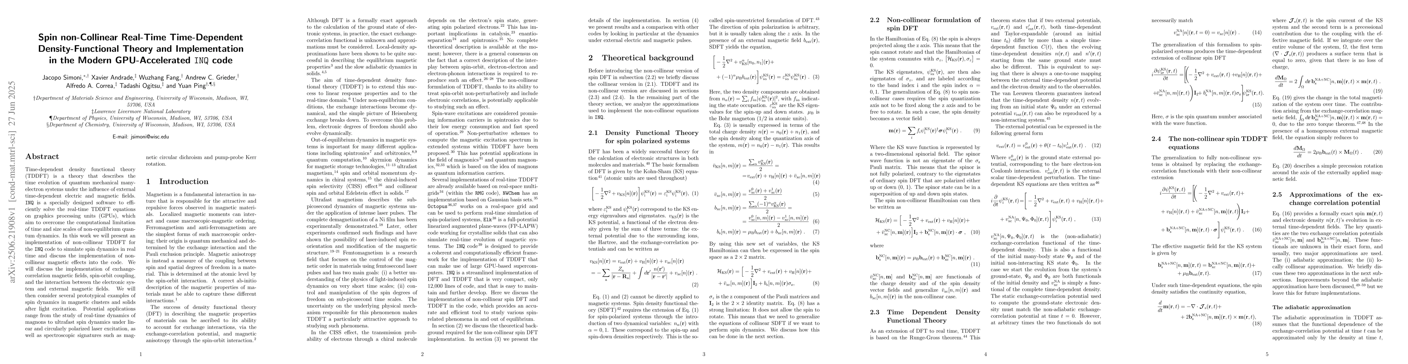 Time-dependent density functional theory (TDDFT) is a theory that describes the time evolution of quantum mechanical many-electron systems under the influence of external time-dependent electric and magnetic fields. INQ is a specially designed software to efficiently solve the real-time TDDFT equations on graphics processing units (GPUs), which aim to overcome the computational limitation of time and size scales of non-equilibrium quantum dynamics. In this work we will present an implementation of non-collinear TDDFT for the INQ code to simulate spin dynamics in real time and discuss the implementation of non-collinear magnetic effects into the code. We will discuss the implementation of exchange-correlation magnetic fields, spin-orbit coupling, and the interaction between the electronic system and external magnetic fields. We will then consider several prototypical examples of spin dynamics in magnetic clusters and solids after light excitation. Potential applications range from the study of real-time dynamics of magnons to ultrafast spin dynamics under linear and circularly polarized laser excitation, as well as spectroscopic signatures such as magnetic circular dichroism and pump-probe Kerr rotation.