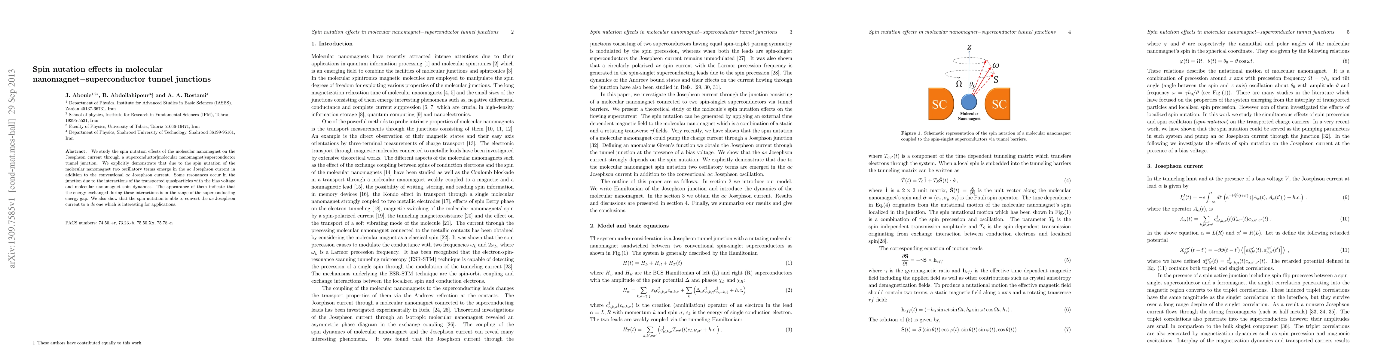 This study investigates the impact of spin nutation in molecular nanomagnets on the Josephson current in superconductor-nanomagnet-superconductor tunnel junctions, revealing additional oscillatory terms in the ac Josephson current and resonances indicating energy exchanges within the superconducting energy gap. The spin nutation is also shown to convert ac to dc Josephson current, which has potential applications.