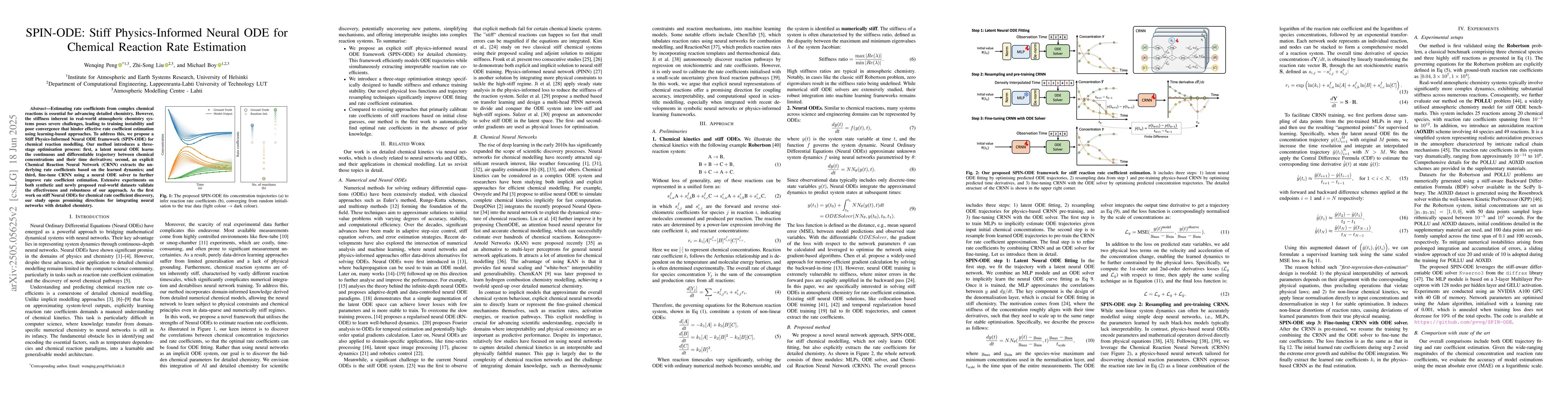 Estimating rate coefficients from complex chemical reactions is essential for advancing detailed chemistry. However, the stiffness inherent in real-world atmospheric chemistry systems poses severe challenges, leading to training instability and poor convergence that hinder effective rate coefficient estimation using learning-based approaches. To address this, we propose a Stiff Physics-Informed Neural ODE framework (SPIN-ODE) for chemical reaction modelling. Our method introduces a three-stage optimisation process: first, a latent neural ODE learns the continuous and differentiable trajectory between chemical concentrations and their time derivatives; second, an explicit Chemical Reaction Neural Network (CRNN) extracts the underlying rate coefficients based on the learned dynamics; and third, fine-tune CRNN using a neural ODE solver to further improve rate coefficient estimation. Extensive experiments on both synthetic and newly proposed real-world datasets validate the effectiveness and robustness of our approach. As the first work on stiff Neural ODEs for chemical rate coefficient discovery, our study opens promising directions for integrating neural networks with detailed chemistry.