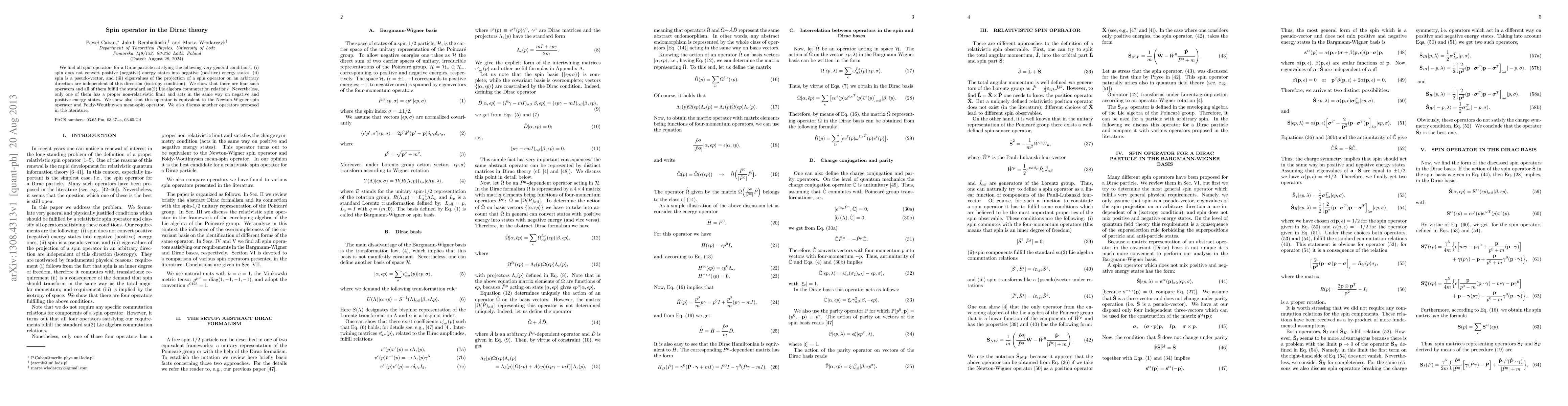 We find all spin operators for a Dirac particle satisfying the following very general conditions: (i) spin does not convert positive (negative) energy states into negative (positive) energy states, (ii) spin is a pseudo-vector, and (iii) eigenvalues of the projection of a spin operator on an arbitrary direction are independent of this direction (isotropy condition). We show that there are four such operators and all of them fulfill the standard su(2) Lie algebra commutation relations. Nevertheless, only one of them has a proper non-relativistic limit and acts in the same way on negative and positive energy states. We show also that this operator is equivalent to the Newton-Wigner spin operator and Foldy-Wouthuysen mean-spin operator. We also discuss another operators proposed in the literature.