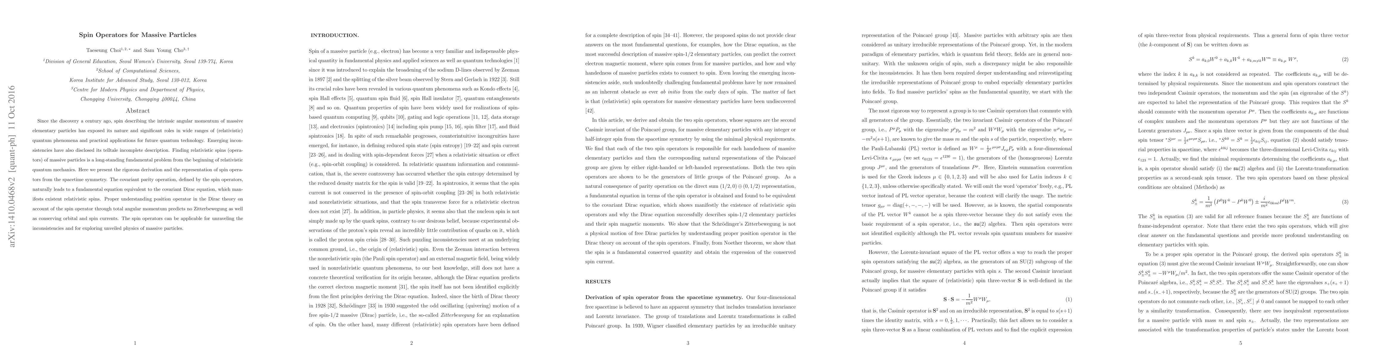 Since the discovery a century ago, spin describing the intrinsic angular momentum of massive elementary particles has exposed its nature and significant roles in wide ranges of (relativistic) quantum phenomena and practical applications for future quantum technology. Emerging inconsistencies have also disclosed its telltale incomplete description. Finding relativistic spins (operators) of massive particles is a long-standing fundamental problem from the beginning of relativistic quantum mechanics. Here we present the rigorous derivation and the representation of spin operators from the spacetime symmetry. The covariant parity operation, defined by the spin operators, naturally leads to a fundamental equation equivalent to the covariant Dirac equation, which manifests existent relativistic spins. Proper understanding position operator in the Dirac theory on account of the spin operator through total angular momentum predicts no Zitterbewegung as well as conserving orbital and spin currents. The spin operators can be applicable for unraveling the inconsistencies and for exploring unveiled physics of massive particles.