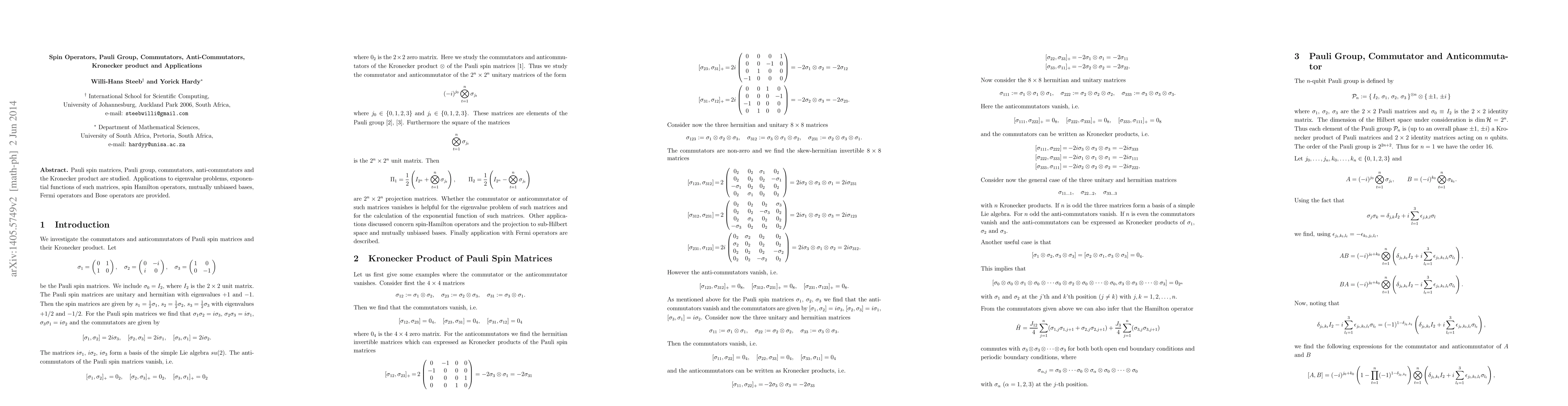 Pauli spin matrices, Pauli group, commutators, anti-commutators and the Kronecker product are studied. Applications to eigenvalue problems, exponential functions of such matrices, spin Hamilton operators, mutually unbiased bases, Fermi operators and Bose operators are provided.