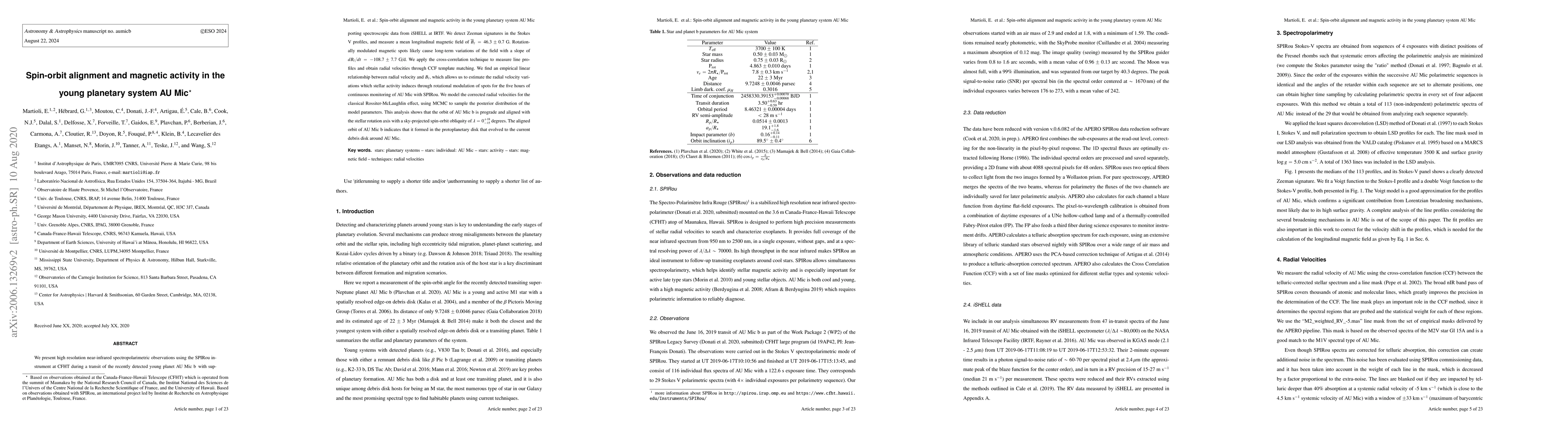 This study uses high-resolution spectropolarimetry to detect Zeeman signatures and measure a mean longitudinal magnetic field of 46.3 G in AU Mic, revealing rotationally modulated magnetic spots. The analysis shows AU Mic b's orbit is prograde and aligned with the stellar rotation axis, indicating its formation in the protoplanetary disk.
