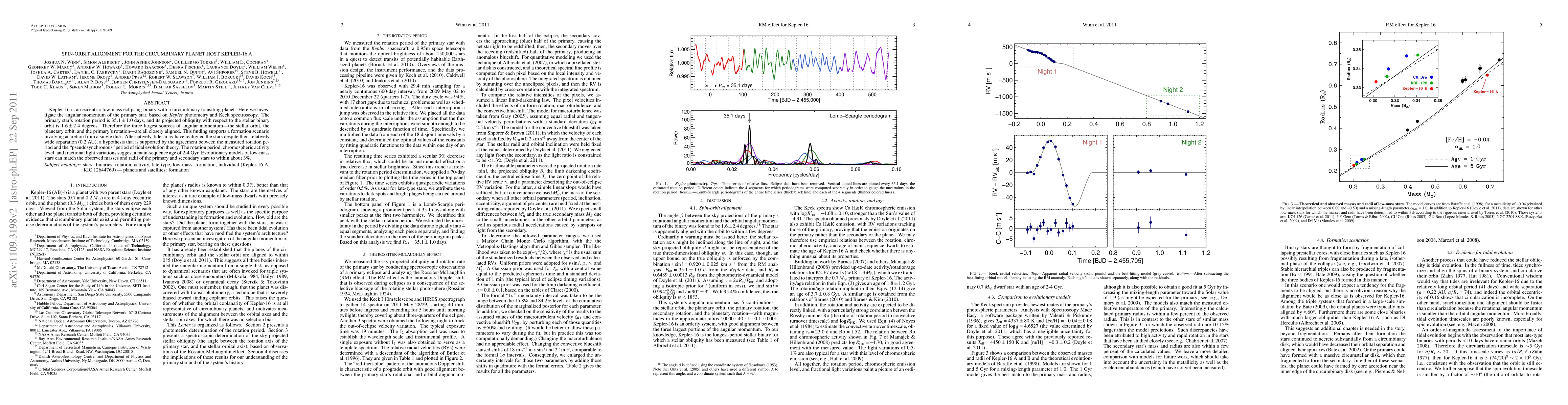 Kepler-16 is an eccentric low-mass eclipsing binary with a circumbinary transiting planet. Here we investigate the angular momentum of the primary star, based on Kepler photometry and Keck spectroscopy. The primary star's rotation period is 35.1 +/- 1.0 days, and its projected obliquity with respect to the stellar binary orbit is 1.6 +/- 2.4 degrees. Therefore the three largest sources of angular momentum---the stellar orbit, the planetary orbit, and the primary's rotation---are all closely aligned. This finding supports a formation scenario involving accretion from a single disk. Alternatively, tides may have realigned the stars despite their relatively wide separation (0.2 AU), a hypothesis that is supported by the agreement between the measured rotation period and the "pseudosynchronous" period of tidal evolution theory. The rotation period, chromospheric activity level, and fractional light variations suggest a main-sequence age of 2-4 Gyr. Evolutionary models of low-mass stars can match the observed masses and radii of the primary and secondary stars to within about 3%.