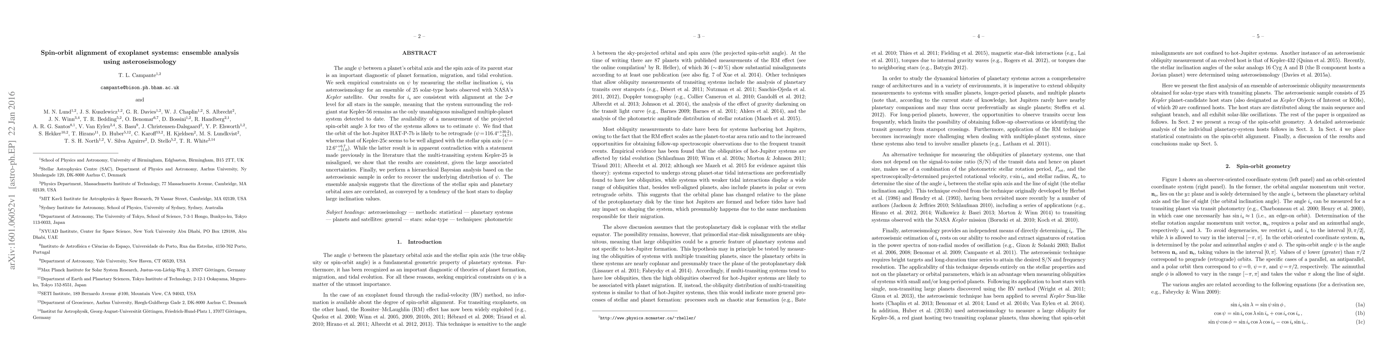 The angle $\psi$ between a planet's orbital axis and the spin axis of its parent star is an important diagnostic of planet formation, migration, and tidal evolution. We seek empirical constraints on $\psi$ by measuring the stellar inclination $i_{\rm s}$ via asteroseismology for an ensemble of 25 solar-type hosts observed with NASA's Kepler satellite. Our results for $i_{\rm s}$ are consistent with alignment at the 2-$\sigma$ level for all stars in the sample, meaning that the system surrounding the red-giant star Kepler-56 remains as the only unambiguous misaligned multiple-planet system detected to date. The availability of a measurement of the projected spin-orbit angle $\lambda$ for two of the systems allows us to estimate $\psi$. We find that the orbit of the hot-Jupiter HAT-P-7b is likely to be retrograde ($\psi=116.4^{+30.2}_{-14.7}\:{\rm deg}$), whereas that of Kepler-25c seems to be well aligned with the stellar spin axis ($\psi=12.6^{+6.7}_{-11.0}\:{\rm deg}$). While the latter result is in apparent contradiction with a statement made previously in the literature that the multi-transiting system Kepler-25 is misaligned, we show that the results are consistent, given the large associated uncertainties. Finally, we perform a hierarchical Bayesian analysis based on the asteroseismic sample in order to recover the underlying distribution of $\psi$. The ensemble analysis suggests that the directions of the stellar spin and planetary orbital axes are correlated, as conveyed by a tendency of the host stars to display large inclination values.