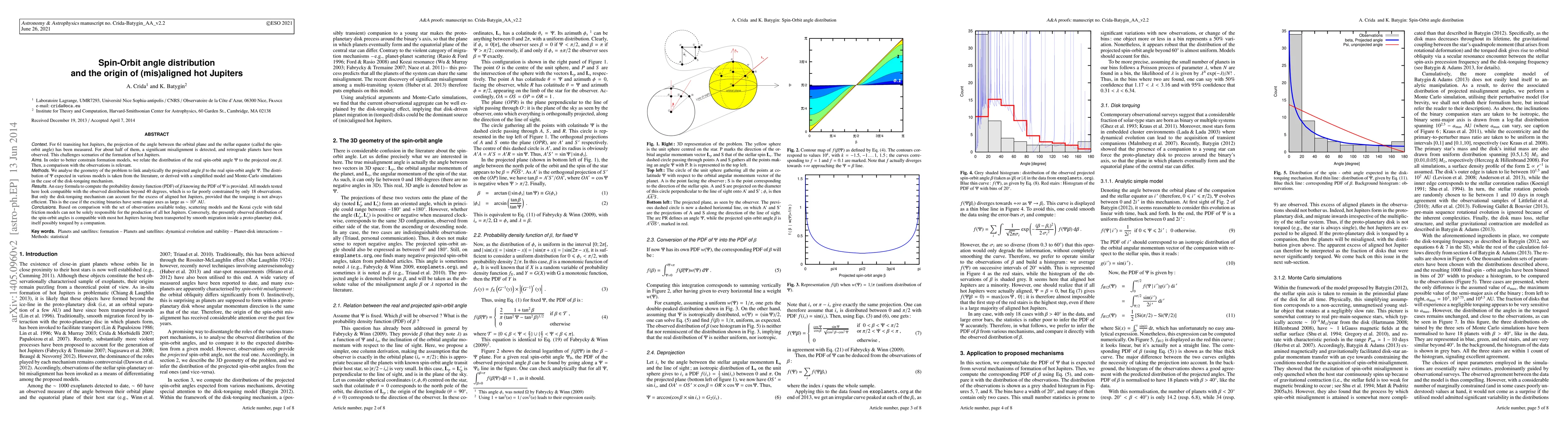 For 61 transiting hot Jupiters, the projection of the angle between the orbital plane and the stellar equator (called the spin-orbit angle) has been measured. For about half of them, a significant misalignment is detected, and retrograde planets have been observed. This challenges scenarios of the formation of hot Jupiters. In order to better constrain formation models, we relate the distribution of the real spin-orbit angle $\Psi$ to the projected one $\beta$. Then, a comparison with the observations is relevant. We analyse the geometry of the problem to link analytically the projected angle $\beta$ to the real spin-orbit angle $\Psi$. The distribution of $\Psi$ expected in various models is taken from the literature, or derived with a simplified model and Monte-Carlo simulations in the case of the disk-torquing mechanism. An easy formula to compute the probability density function (PDF) of $\beta$ knowing the PDF of $\Psi$ is provided. All models tested here look compatible with the observed distribution beyond 40 degrees, which is so far poorly constrained by only 18 observations. But only the disk-torquing mechanism can account for the excess of aligned hot Jupiters, provided that the torquing is not always efficient. This is the case if the exciting binaries have semi-major axes as large as 10000 AU. Based on comparison with the set of observations available today, scattering models and the Kozai cycle with tidal friction models can not be solely responsible for the production of all hot Jupiters. Conversely, the presently observed distribution of the spin-orbit angles is compatible with most hot Jupiters having been transported by smooth migration inside a proto-planetary disk, itself possibly torqued by a companion.