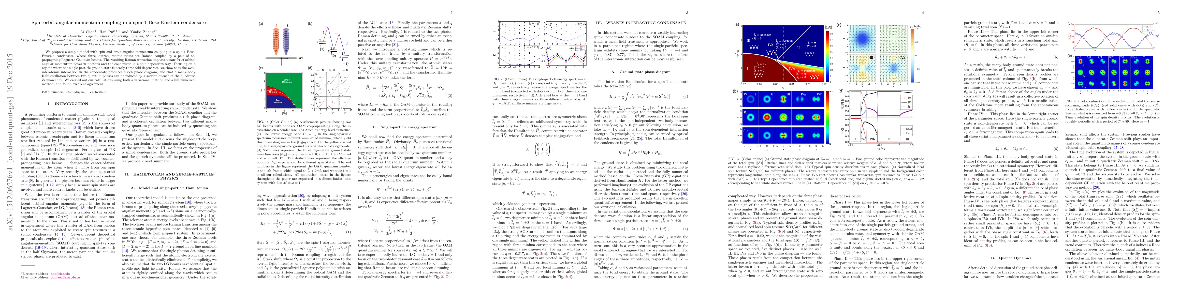 This paper proposes a model for spin-orbit angular momentum coupling in a spin-1 Bose-Einstein condensate using Raman transitions induced by Laguerre-Gaussian beams, revealing a rich phase diagram and many-body Rabi oscillations upon quenching the Zeeman shift. Both variational and numerical methods confirm the model's predictions.