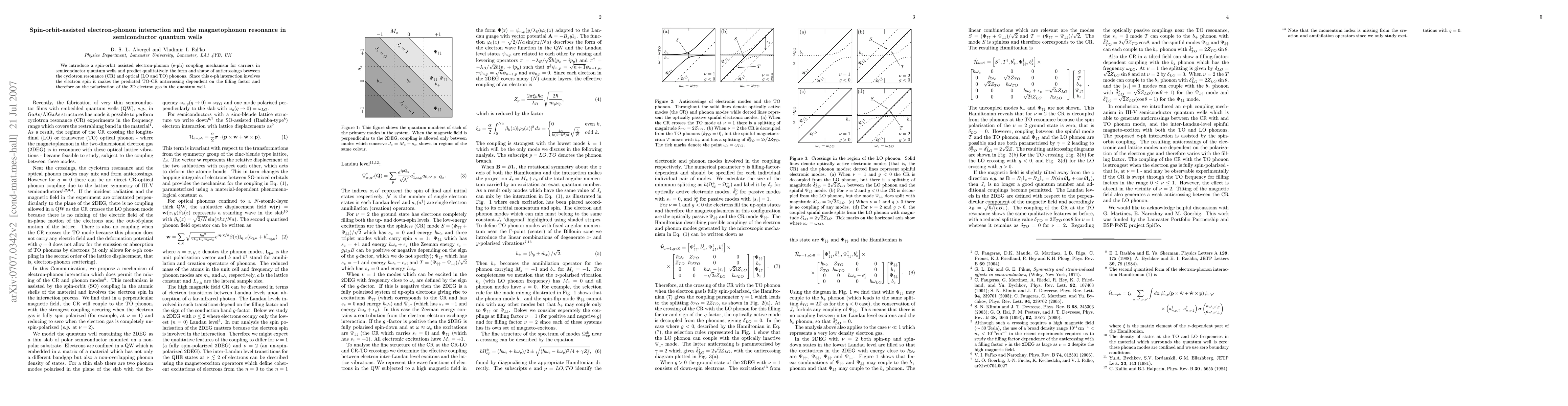 This paper proposes a spin-orbit-assisted electron-phonon coupling mechanism in semiconductor quantum wells, predicting the form and shape of anticrossings between cyclotron resonance and optical phonons, with the TO-CR anticrossing dependent on the filling factor and polarization of the 2D electron gas.