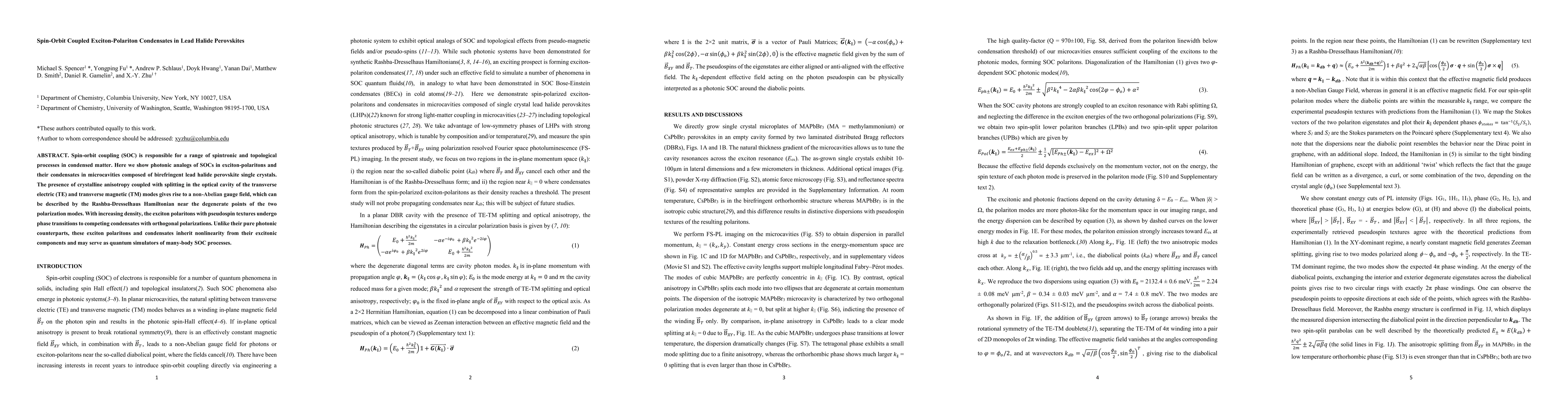 This paper investigates spin-orbit coupled exciton-polariton condensates in lead halide perovskites, demonstrating photonic analogs of spin-orbit coupling and revealing non-Abelian gauge fields in microcavities. These condensates, with pseudospin textures, undergo phase transitions and may function as quantum simulators for many-body spin-orbit processes due to their inherent nonlinearity.