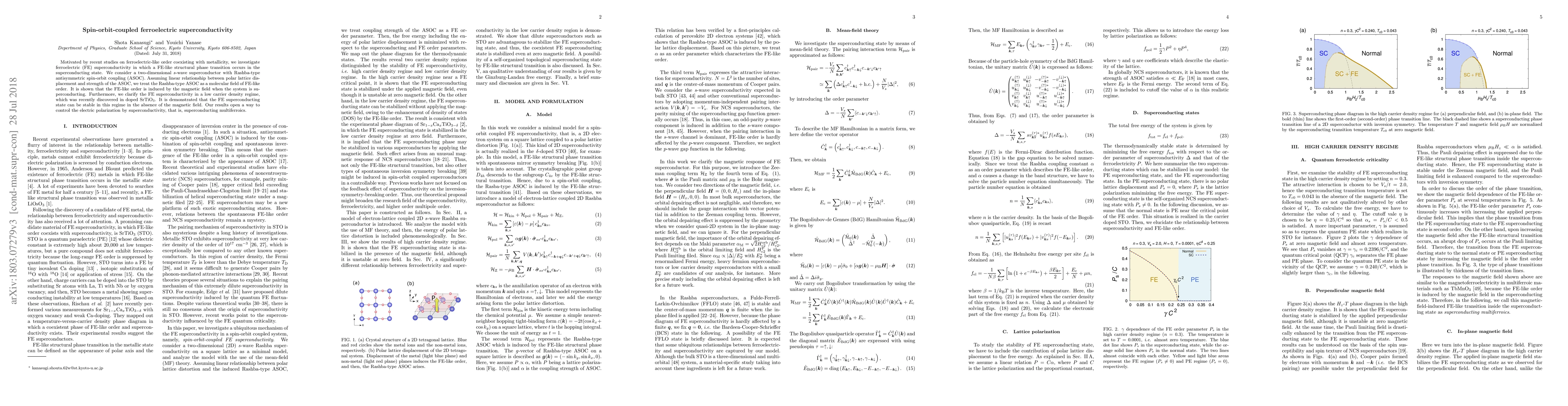 Motivated by recent studies on ferroelectric-like order coexisting with metallicity, we investigate ferroelectric (FE) superconductivity in which a FE-like structural phase transition occurs in the superconducting state. We consider a two-dimensional s-wave superconductor with Rashba-type antisymmetric spin-orbit coupling (ASOC). Assuming linear relationship between polar lattice displacement and strength of the ASOC, we treat the Rashba-type ASOC as a molecular field of FE-like order. It is shown that the FE-like order is induced by the magnetic field when the system is superconducting. Furthermore, we clarify the FE superconductivity in a low carrier density regime, which was recently discovered in doped SrTiO$_3$. It is demonstrated that the FE superconducting state can be stable in this regime in the absence of the magnetic field. Our results open a way to control the electric polarization by superconductivity, that is, superconducting multiferroics.