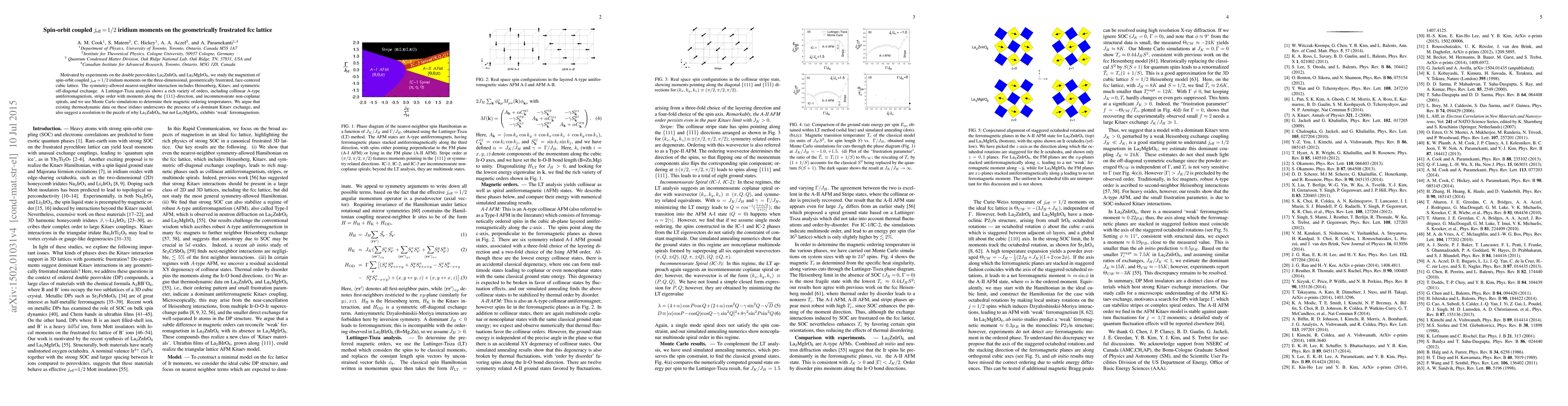 Motivated by experiments on the double perovskites La2ZnIrO6 and La2MgIrO6, we study the magnetism of spin-orbit coupled j=1/2 iridium moments on the three-dimensional, geometrically frustrated, face-centered cubic lattice. The symmetry-allowed nearest-neighbor interaction includes Heisenberg, Kitaev, and symmetric off-diagonal exchange. A Luttinger-Tisza analysis shows a rich variety of orders, including collinear A-type antiferromagnetism, stripe order with moments along the [111]-direction, and incommensurate non-coplanar spirals, and we use Monte Carlo simulations to determine their magnetic ordering temperatures. We argue that existing thermodynamic data on these iridates underscores the presence of a dominant Kitaev exchange, and also suggest a resolution to the puzzle of why La2ZnIrO6 exhibits `weak' ferromagnetism, but La2MgIrO6 does not.