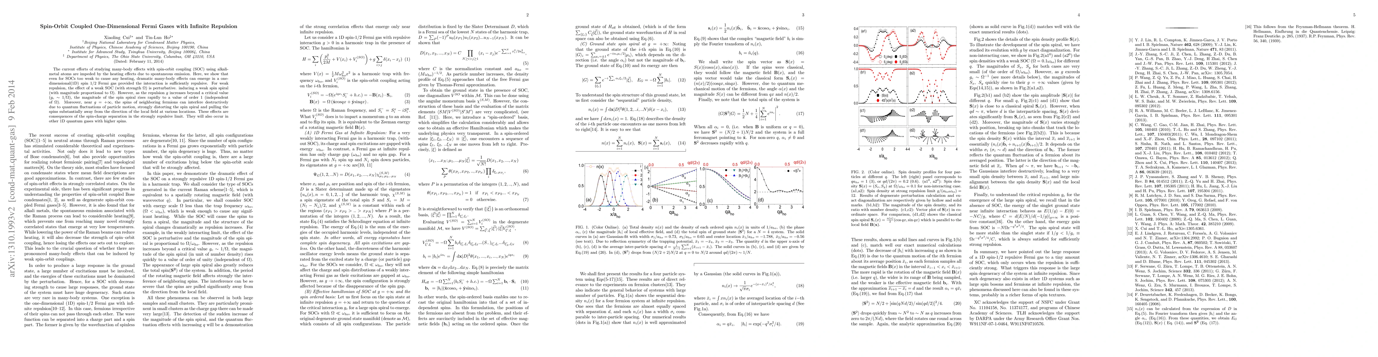 The current efforts of studying many-body effects with spin-orbit coupling (SOC) using alkali-metal atoms are impeded by the heating effects due to spontaneous emission. Here, we show that even for SOCs too weak to cause any heating, dramatic many-body effects can emerge in a one-dimensional(1D) spin 1/2 Fermi gas provided the interaction is sufficiently repulsive. For weak repulsion, the effect of a weak SOC (with strength $\Omega$) is perturbative. inducing a weak spin spiral (with magnitude proportional to $\Omega$). However, as the repulsion $g$ increases beyond a critical value ($g_c\sim 1/\Omega$), the magnitude of the spin spiral rises rapidly to a value of order 1 (independent of $\Omega$). Moreover, near $g=+\infty$, the spins of neighboring fermions can interfere destructively due to quantum fluctuations of particle motion, strongly distorting the spin spiral and pulling the spins substantially away from the direction of the local field at various locations. These effects are consequences of the spin-charge separation in the strongly repulsive limit. They will also occur in other 1D quantum gases with higher spins.