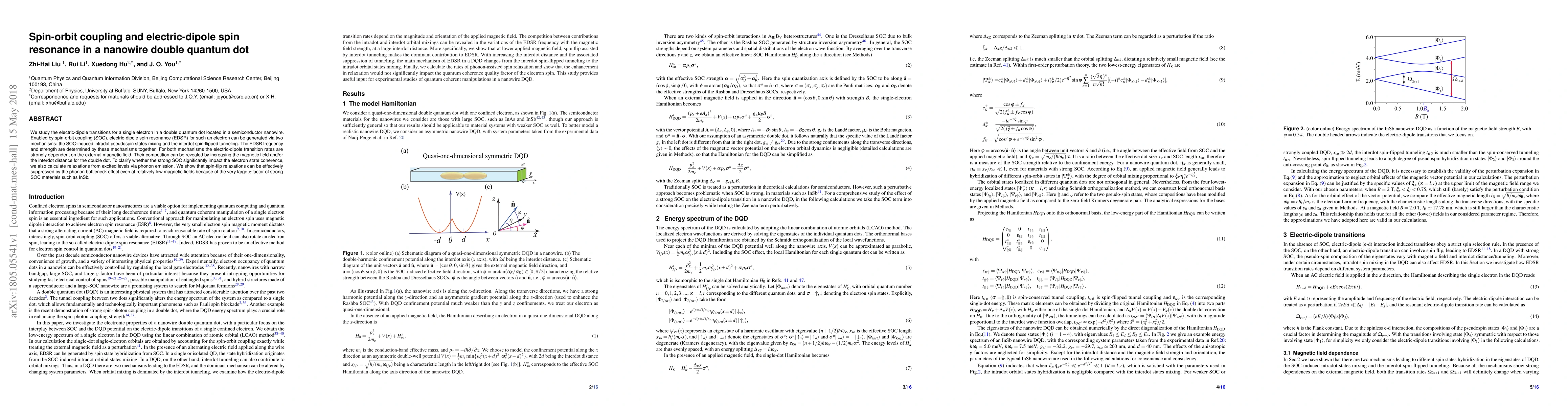 We study the electric-dipole transitions for a single electron in a double quantum dot located in a semiconductor nanowire. Enabled by spin-orbit coupling (SOC), electric-dipole spin resonance (EDSR) for such an electron can be generated via two mechanisms: the SOC-induced intradot pseudospin states mixing and the interdot spin-flipped tunneling. The EDSR frequency and strength are determined by these mechanisms together. For both mechanisms the electric-dipole transition rates are strongly dependent on the external magnetic field. Their competition can be revealed by increasing the magnetic field and/or the interdot distance for the double dot. To clarify whether the strong SOC significantly impact the electron state coherence, we also calculate relaxations from excited levels via phonon emission. We show that spin-flip relaxations can be effectively suppressed by the phonon bottleneck effect even at relatively low magnetic fields because of the very large $g$-factor of strong SOC materials such as InSb.
