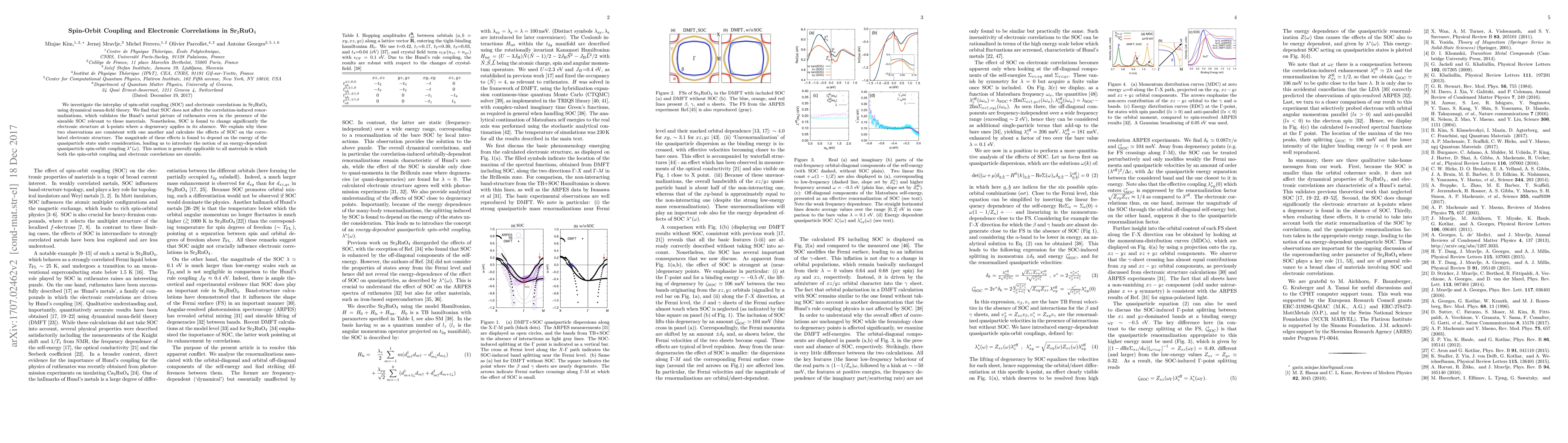 We investigate the interplay of spin-orbit coupling (SOC) and electronic correlations in Sr2RuO4 using dynamical mean-field theory. We find that SOC does not affect the correlation-induced renormalizations, which validates the Hund's metal picture of ruthenates even in the presence of the sizable SOC relevant to these materials. Nonetheless, SOC found to change significantly the electronic structure at k-points where a degeneracy applies in its absence. We explain why these two observations are consistent with one another and calculate effects of SOC on the correlated electronic structure. The magnitude of these effects is found to depend on the energy of the quasiparticle state under consideration, leading us to introduce the notion of an "energy-dependent quasiparticle spin-orbit coupling". This notion is generally applicable to all materials in which both the spin-orbit coupling and electronic correlations are sizable.