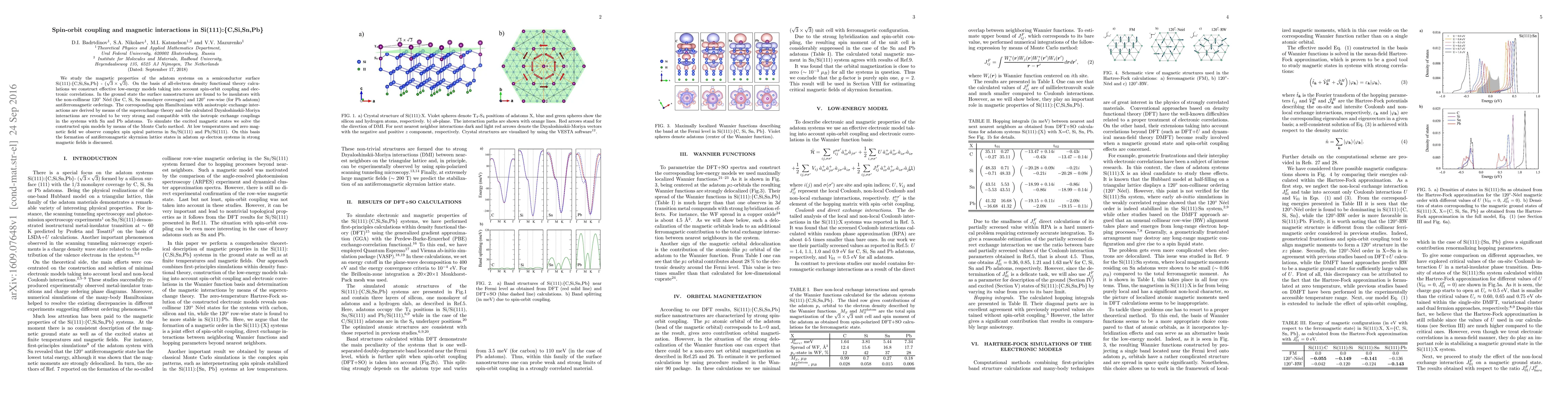 We study the magnetic properties of the adatom systems on a semiconductor surface Si(111):\{C,Si,Sn,Pb\} - ($\sqrt{3} \times \sqrt{3}$). On the basis of all-electron density functional theory calculations we construct effective low-energy models taking into account spin-orbit coupling and electronic correlations. In the ground state the surface nanostructures are found to be insulators with the non-collinear 120$^{\circ}$ N\'eel (for C, Si, Sn monolayer coverages) and 120$^{\circ}$ row-wise (for Pb adatom) antiferromagnetic orderings. The corresponding spin Hamiltonians with anisotropic exchange interactions are derived by means of the superexchange theory and the calculated Dzyaloshinskii-Moriya interactions are revealed to be very strong and compatible with the isotropic exchange couplings in the systems with Sn and Pb adatoms. To simulate the excited magnetic states we solve the constructed spin models by means of the Monte Carlo method. At low temperatures and zero magnetic field we observe complex spin spiral patterns in Sn/Si(111) and Pb/Si(111). On this basis the formation of antiferromagnetic skyrmion lattice states in adatom $sp$ electron systems in strong magnetic fields is discussed.