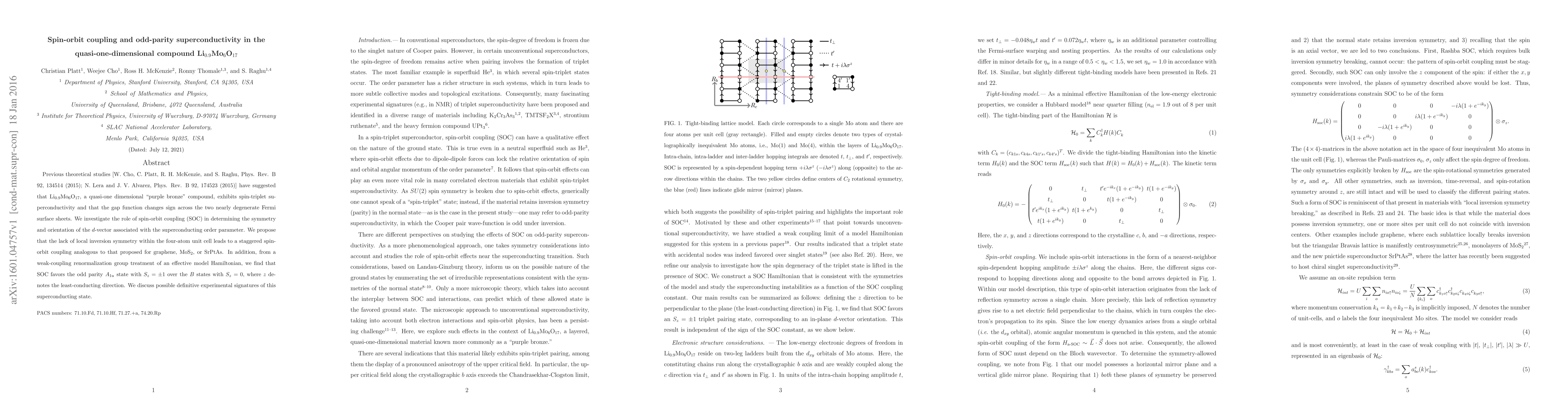 This paper explores the role of spin-orbit coupling in determining the superconducting order parameter in the quasi-one-dimensional compound Li$_{0.9}$Mo$_6$O$_{17}$. It proposes that the lack of local inversion symmetry favors an odd-parity $A_{1u}$ superconducting state over even-parity states, suggesting potential experimental signatures for this unique superconductivity.