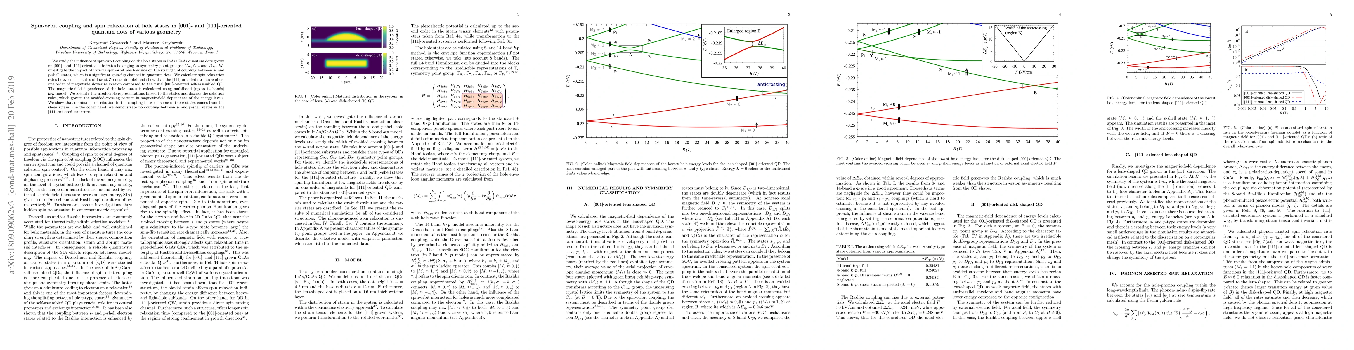 We study the influence of spin-orbit coupling on the hole states in InAs/GaAs quantum dots grown on [001]- and [111]-oriented substrates belonging to symmetry point groups: C2v, C3v and D2d. We investigate the impact of various spin-orbit mechanisms on the strength of coupling between s- and p-shell states, which is a significant spin-flip channel in quantum dots. We calculate spin relaxation rates between the states of lowest Zeeman doublet and show that the [111]-oriented structure offers one order of magnitude slower relaxation compared to the usual [001]-oriented self-assembled QD. The magnetic-field dependence of the hole states is calculated using multiband (up to 14 bands) k.p model. We identify the irreducible representations linked to the states and discuss the selection rules, which govern the avoided-crossing pattern in magnetic-field dependence of the energy levels. We show that dominant contribution to the coupling between some of these states comes from the shear strain. On the other hand, we demonstrate no coupling between s- and p-shell states in the [111]-oriented structure.