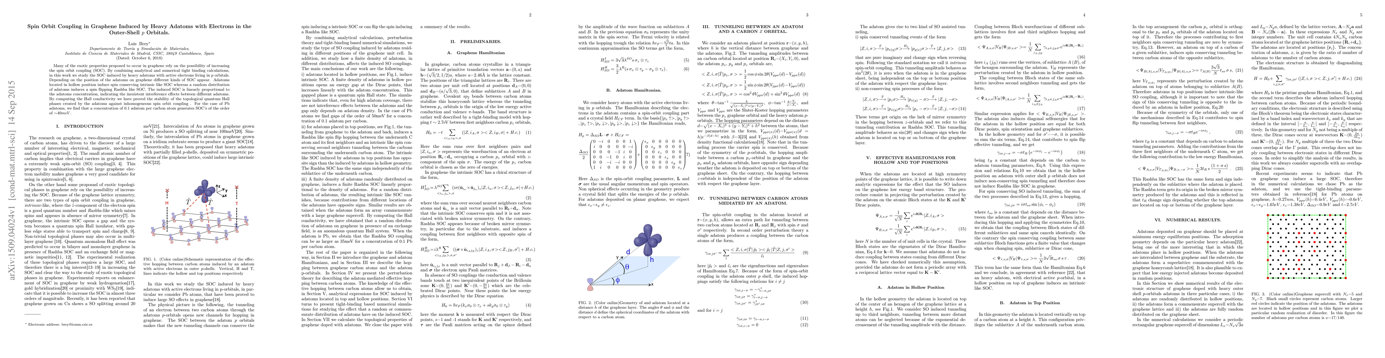 This paper investigates the spin-orbit coupling (SOC) in graphene induced by heavy adatoms with electrons in $p$ orbitals, finding that adatoms in hollow positions create intrinsic SOC while random distributions induce Rashba-like SOC. The study confirms the stability of topological quantum Hall phases against inhomogeneous SOC, with Pb adatoms showing SOC of $\sim$40 meV at a concentration of 0.1 per carbon atom.