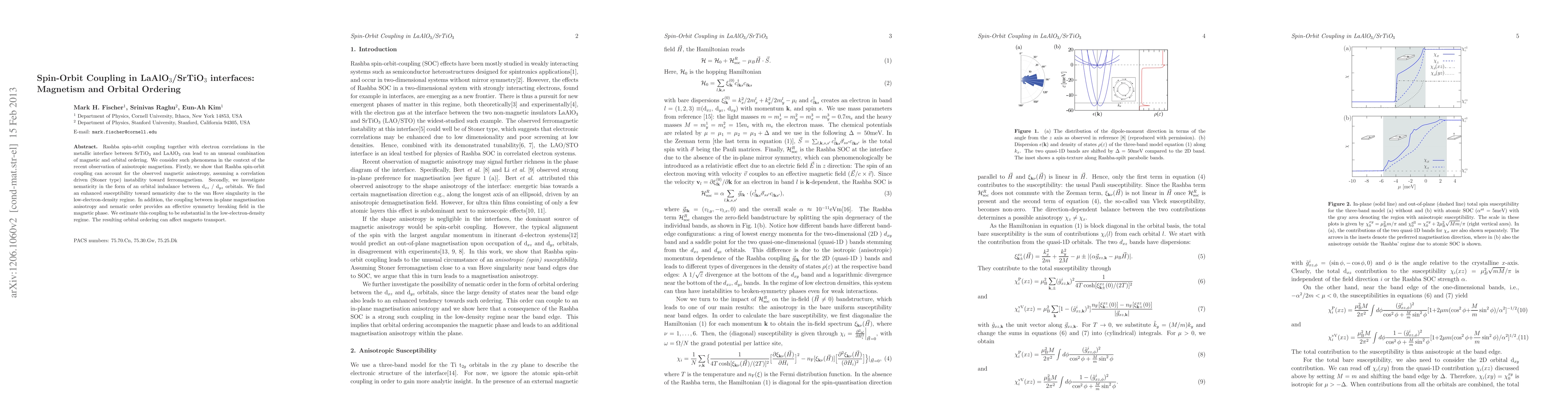 The combination of Rashba spin-orbit coupling and electron correlations can induce unusual phenomena in the metallic interface between SrTiO$_3$ and LaAlO$_3$. We consider effects of Rashba spin-orbit coupling at this interface in the context of the recent observation of anisotropic magnetism. Firstly, we show how Rashba spin-orbit coupling in a system near a band-edge can account for the observed magnetic anisotropy. Secondly, we investigate the coupling between in-plane magnetic-moment anisotropy and nematicity in the form of an orbital imbalance between d$_{xz}$ / d$_{yz}$ orbitals. We estimate this coupling to be substantial in the low electron density regime. Such an orbital ordering can affect magneto transport.
