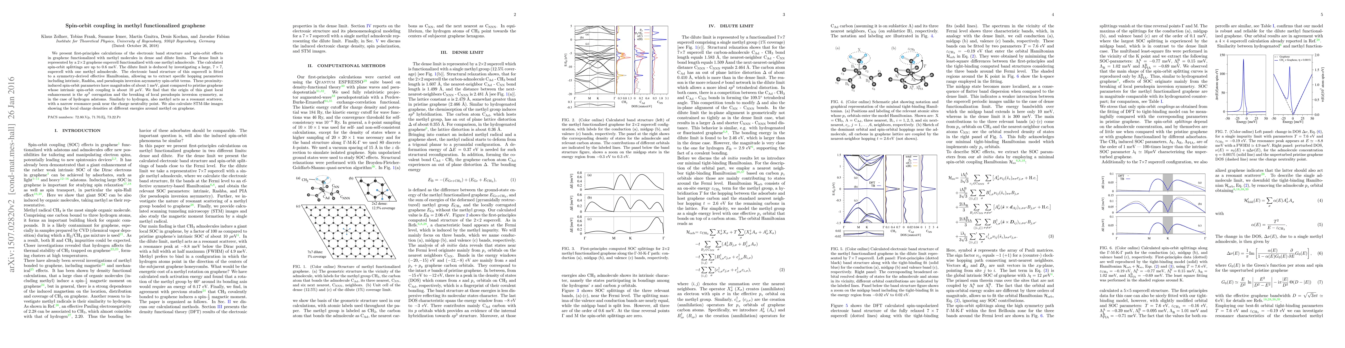 We present first-principles calculations of the electronic band structure and spin-orbit effects in graphene functionalized with methyl molecules in dense and dilute limits. The dense limit is represented by a 2$\times$2 graphene supercell functionalized with one methyl admolecule. The calculated spin-orbit splittings are up to $0.6$ meV. The dilute limit is deduced by investigating a large, 7$\times$7, supercell with one methyl admolecule. The electronic band structure of this supercell is fitted to a symmetry-derived effective Hamiltonian, allowing us to extract specific hopping parameters including intrinsic, Rashba, and PIA (pseudospin inversion asymmetry) spin-orbit terms. These proximity-induced spin-orbit parameters have magnitudes of about 1 meV, giant compared to pristine graphene whose intrinsic spin-orbit coupling is about 10 $\mu$eV. We find that the origin of this giant local enhancement is the $sp^3$ corrugation and the breaking of local pseudospin inversion symmetry, as in the case of hydrogen adatoms. Also similar to hydrogen, methyl acts as a resonant scatterer, with a narrow resonance peak near the charge neutrality point. We also calculate STM-like images showing the local charge densities at different energies around methyl on graphene.