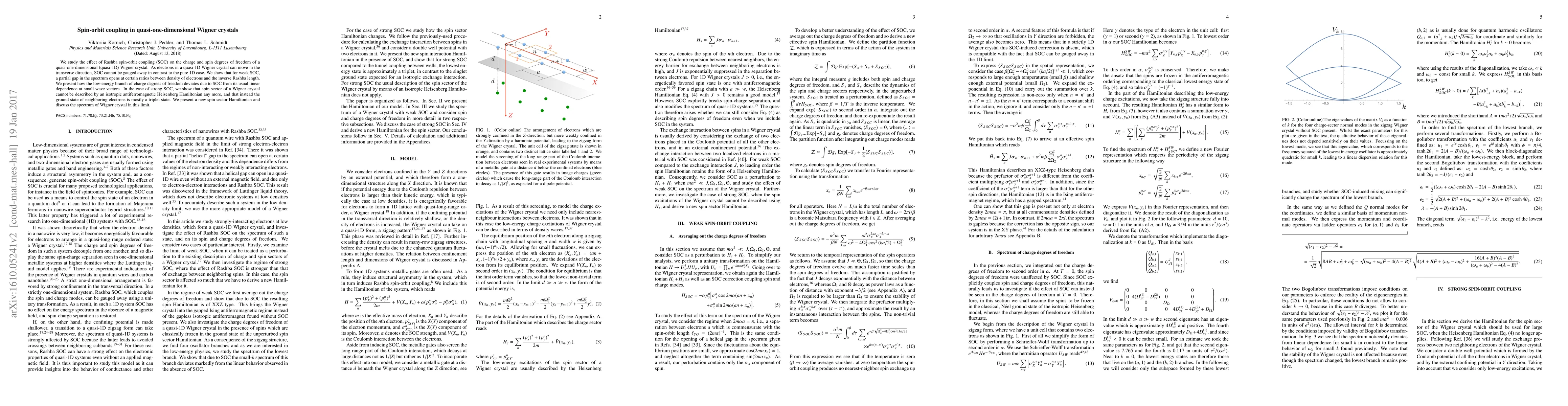 This paper investigates the impact of Rashba spin-orbit coupling on quasi-one-dimensional Wigner crystals, revealing that weak SOC induces a partial gap and alters charge dynamics, while strong SOC leads to a triplet ground state and necessitates a new spin sector Hamiltonian.