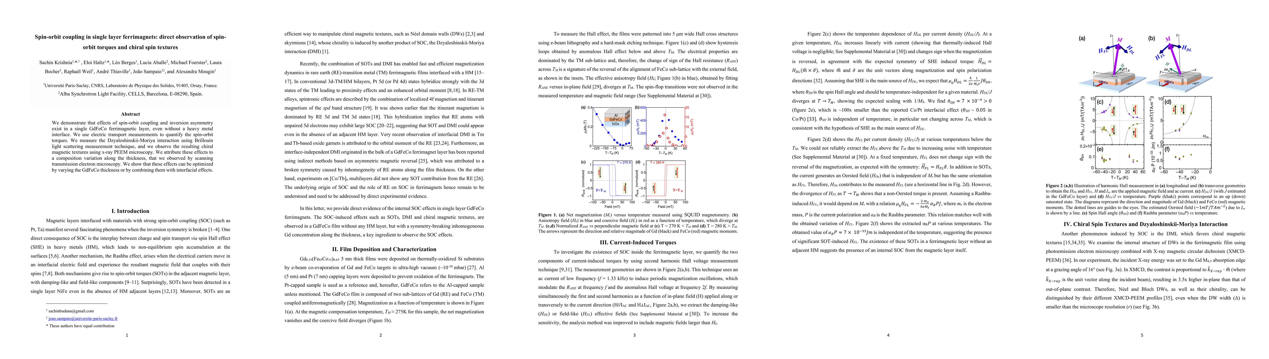 This paper demonstrates spin-orbit coupling and inversion asymmetry in a single GdFeCo ferrimagnetic layer, quantified via electric transport and observed via Brillouin light scattering and x-ray PEEM microscopy. The effects are attributed to composition variation along the thickness, optimized by adjusting layer thickness or combining with interfacial effects.