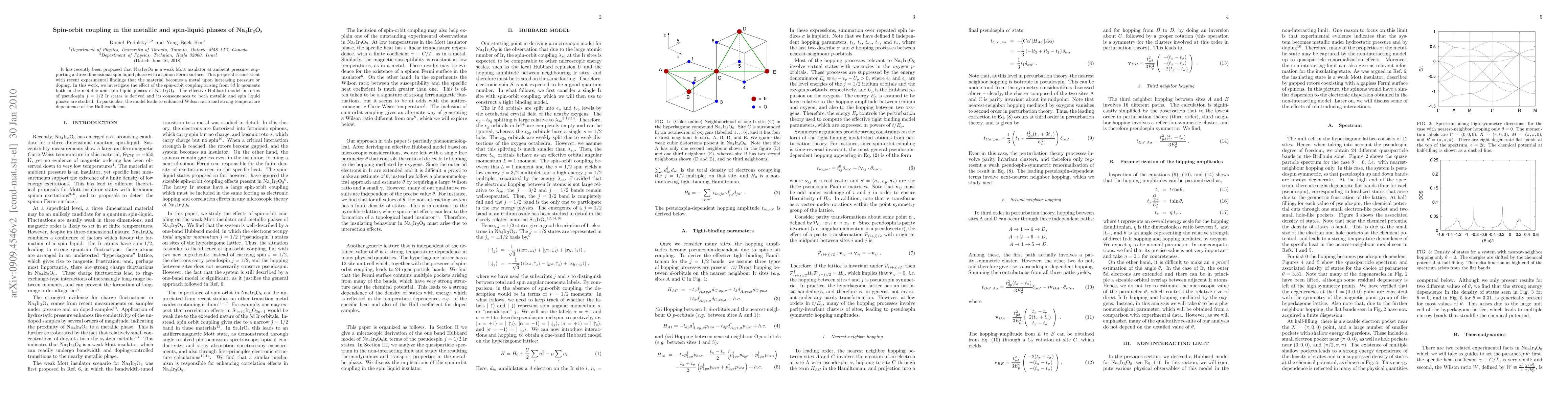 It has recently been proposed that Na4Ir3O8 is a weak Mott insulator at ambient pressure, supporting a three-dimensional spin liquid phase with a spinon Fermi surface. This proposal is consistent with recent experimental findings that the material becomes a metal upon increasing pressure or doping. In this work, we investigate the effect of the spin-orbit coupling arising from 5d Ir moments both in the metallic and spin liquid phases of Na4Ir3O8. The effective Hubbard model in terms of pseudospin j=1/2 Ir states is derived and its consequences to both metallic and spin liquid phases are studied. In particular, the model leads to enhanced Wilson ratio and strong temperature dependence of the Hall coefficient.