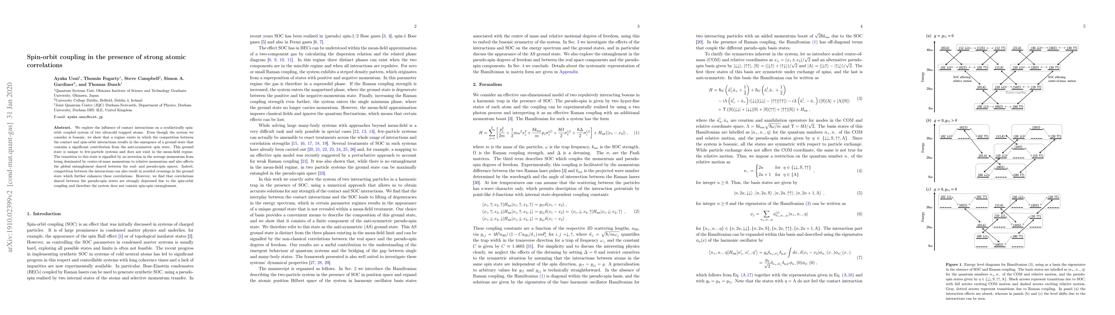 We explore the influence of contact interactions on a synthetically spin-orbit coupled system of two ultracold trapped atoms. Even though the system we consider is bosonic, we show that a regime exists in which the competition between the contact and spin-orbit interactions results in the emergence of a ground state that contains a significant contribution from the anti-symmetric spin state. This ground state is unique to few-particle systems and does not exist in the mean-field regime. The transition to this state is signalled by an inversion in the average momentum from being dominated by centre-of-mass momentum to relative momentum and also affects the global entanglement shared between the real- and pseudo-spin spaces. Indeed, competition between the interactions can also result in avoided crossings in the groundstate which further enhances these correlations. However, we find that correlations shared between the pseudo-spin states are strongly depressed due to the spin-orbit coupling and therefore the system does not contain spin-spin entanglement.