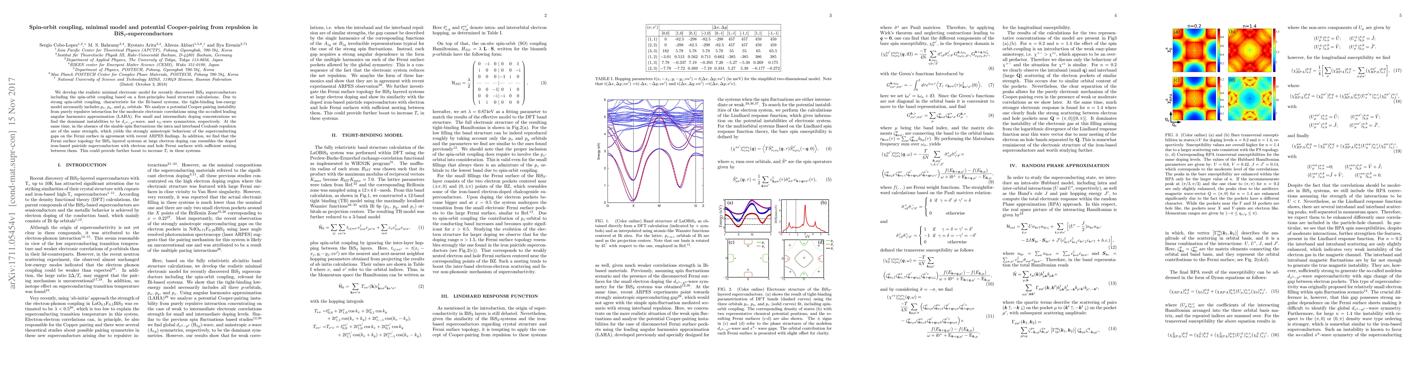 We develop the realistic minimal electronic model for recently discovered BiS$_2$ superconductors including the spin-orbit coupling based on a first-principles band structure calculations. Due to strong spin-orbit coupling, characteristic for the Bi-based systems, the tight-binding low-energy model necessarily includes $p_x$, $p_y$, and $p_z$ orbitals. We analyze a potential Cooper-pairing instability from purely repulsive interaction for the moderate electronic correlations using the so-called leading angular harmonics approximation (LAHA). For small and intermediate doping concentrations we find the dominant instabilities to be $d_{x^2-y^2}$-wave, and $s_{\pm}$-wave symmetries, respectively. At the same time, in the absence of the sizable spin fluctuations the intra and interband Coulomb repulsion are of the same strength, which yields the strongly anisotropic behaviour of the superconducting gaps on the Fermi surface in agreement with recent ARPES findings. In addition, we find that the Fermi surface topology for BiS$_2$ layered systems at large electron doping can resembles the doped iron-based pnictide superconductors with electron and hole Fermi surfaces with sufficient nesting between them. This could provide further boost to increase $T_c$ in these systems.